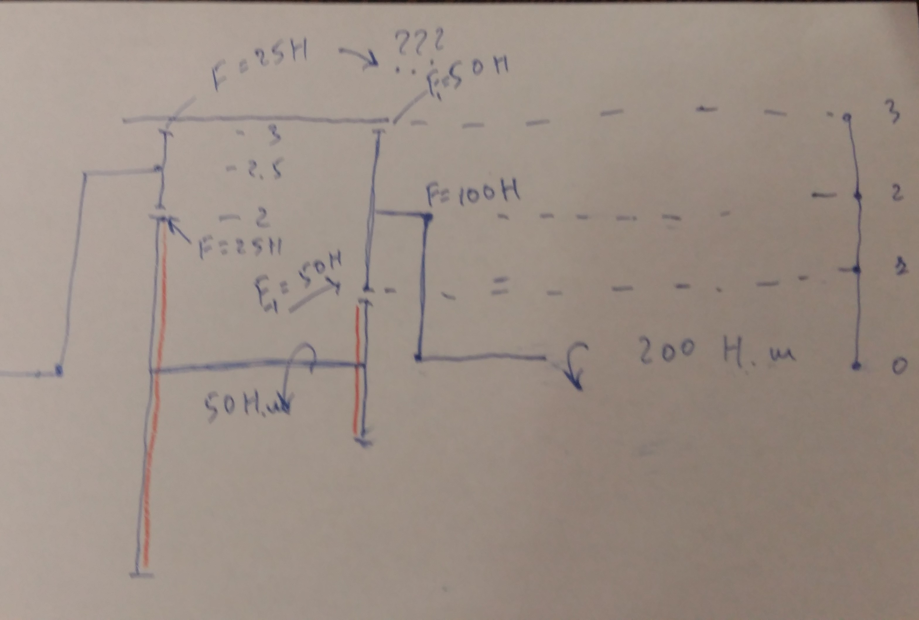 Друга половина червоної має плече в 2 , а значить сила на нижній частині зеленої максимум може сягати 25Н , щоб зелена не проверталась на верхній частині повинно бути 25Н , але зі сторони двигуна на верхню частину передається 50Н