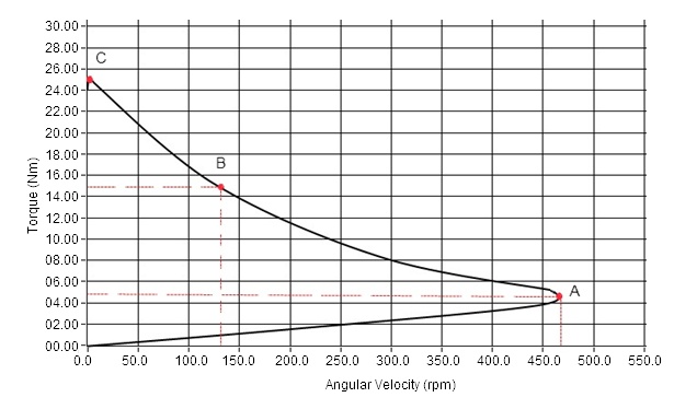 По моему разумению в этом механизме 2 устойчивых положения первое когда момент от входного вала передаётся выходному без изменений, то есть обороты и момент неизменны, и второй когда присутствует редукция(которая очевидно будет зависит от соотношения центральных и коронных шестерней), при этом мы получаем получаем увеличения момента и понижения оборотов, вот только мне не понятно почему на графике точка С обороты падают до нуля? по моему пониманию обороты и момент должны подойти к точке В и оставаться на этом уровне. И скорее график должен выглядеть по другому, от точки 0.0 к В , а потому уже к А.