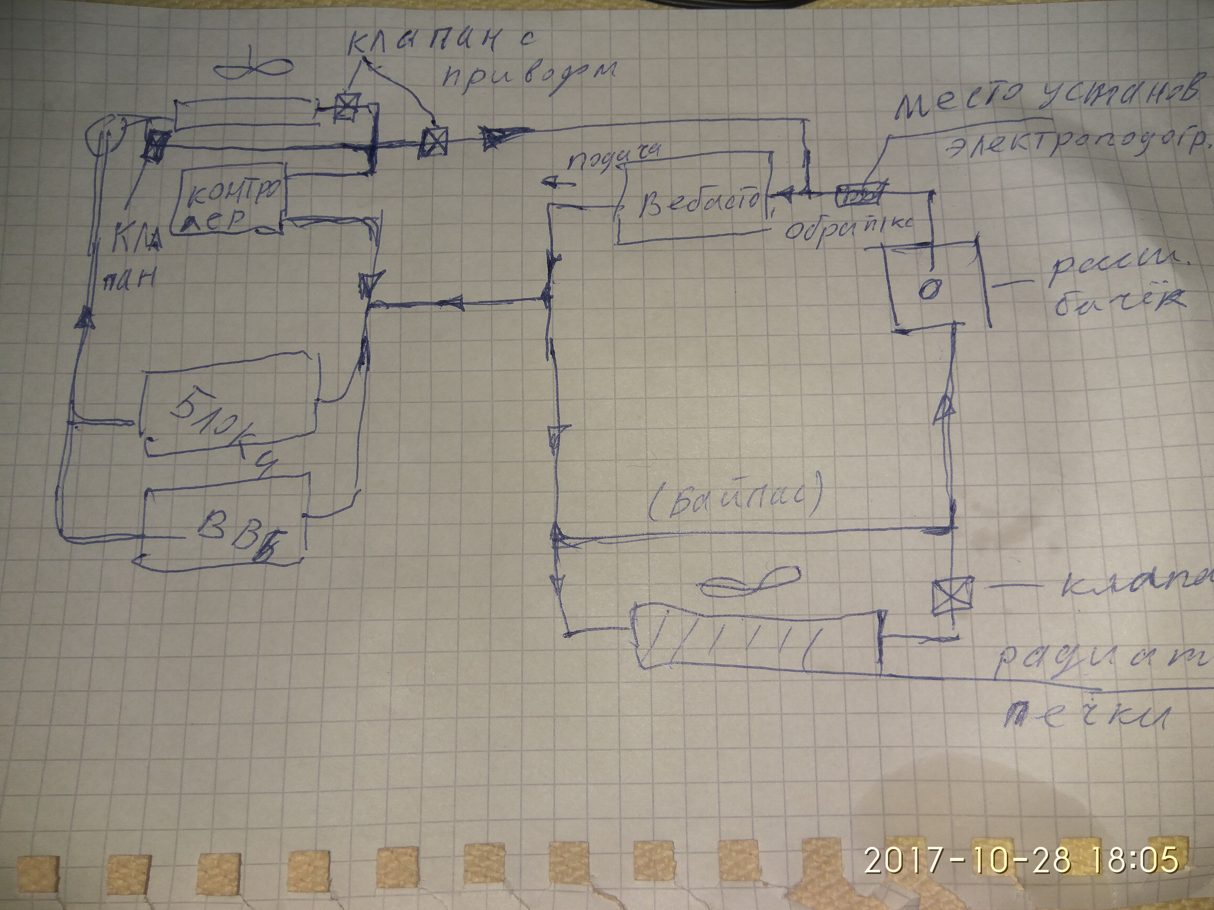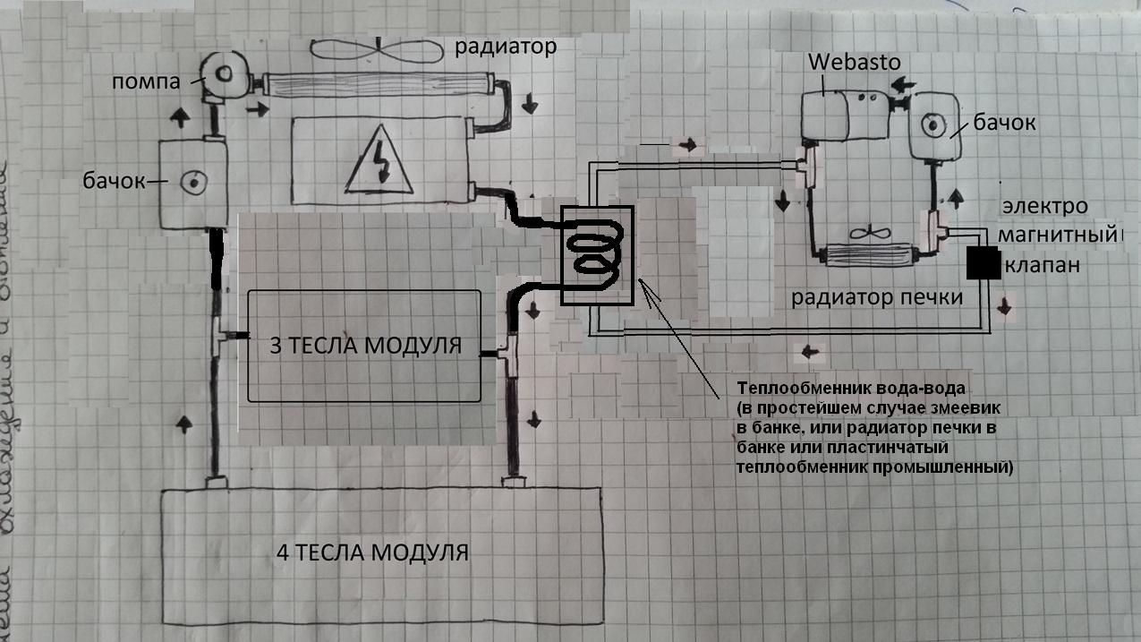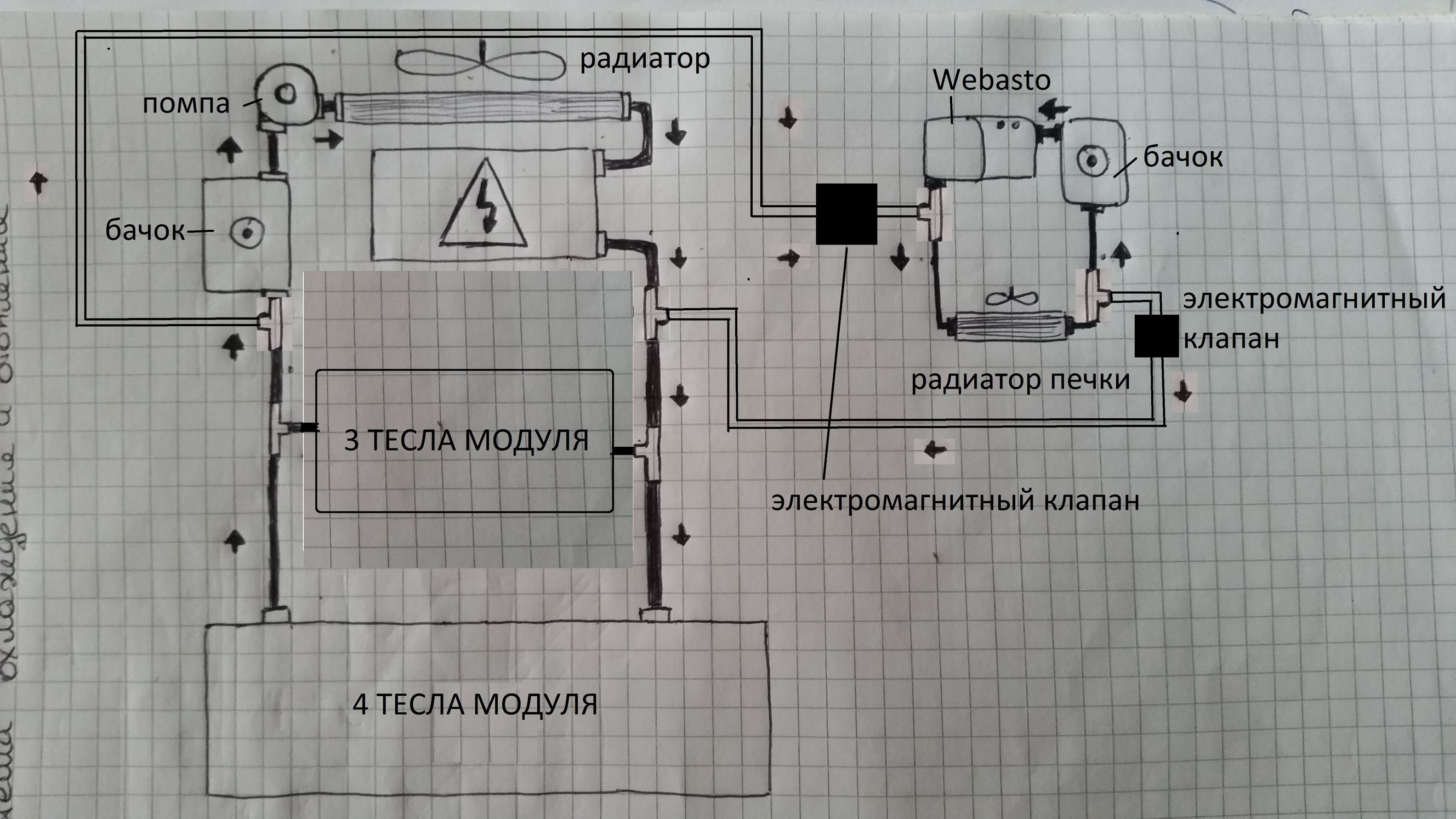 А так как в контуре СО и отопления один и тот же антифриз (можно и универсалку залить) и появилась идея подсоединяться, например электроклапанами, к контуру отопления, если температура батареи ниже например 15°С. Тем более зимой можно заряжать ВВБ только при положительной температуре на ней и чем ближе будет к 25°C тем лучше. По логике если ВВБ нужен будет подогрев, значит и в салоне уже не так и тепло так же. В добавок приятным бонусом возможно было бы еще то, что температура жидкости для радиатора печки была бы уже ниже и возможно не было бы через чур жарко в салоне при не очень холодной температуре снаружи. Но все оно хорошо в теории, пока не перейдешь к практике, но даже еще до нее, умные и опытные люди