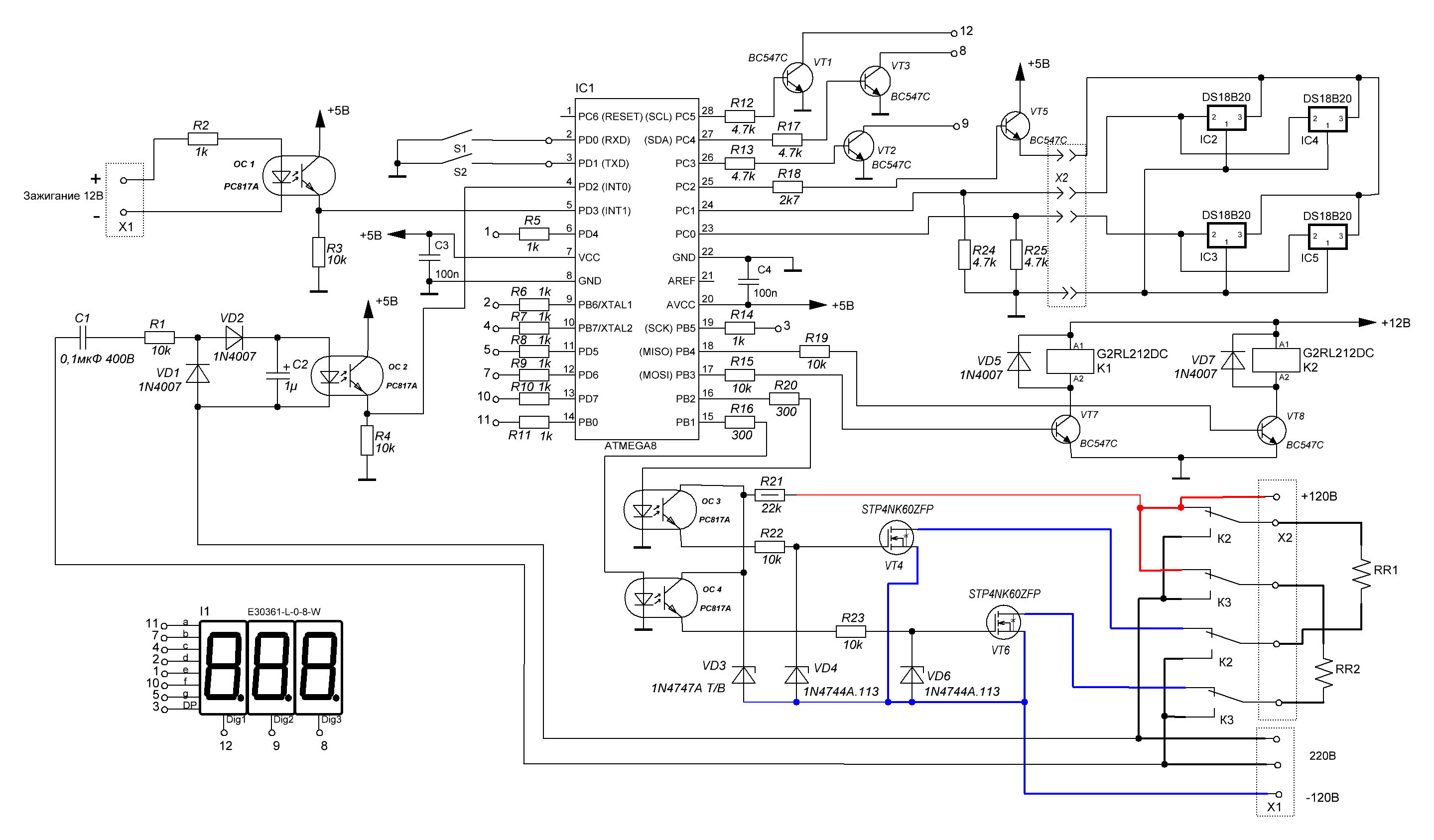 Сейчас обнаружил, что ножек моей любимой ATmega8 не хватает. 4 (датчики) + 11 (индикатор) + 2 (входы состояния электромобиля) + 2 (кнопки настройки) + 2 (выход переменки под два обогревателя) + 2 (выход постоянки на те же обогреватели) + 1(вкл. спящего режима датчиков) = 24 ножки. Я же могу задействовать только 22 ножки. Возможно буду уменьшать устройство до слежения только за одной зоной - 2 датчика и управление только одним обогревателем.