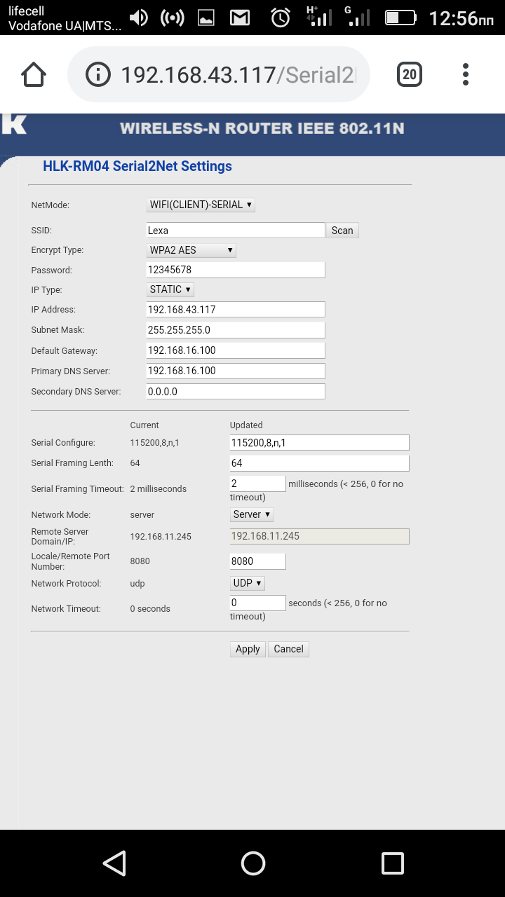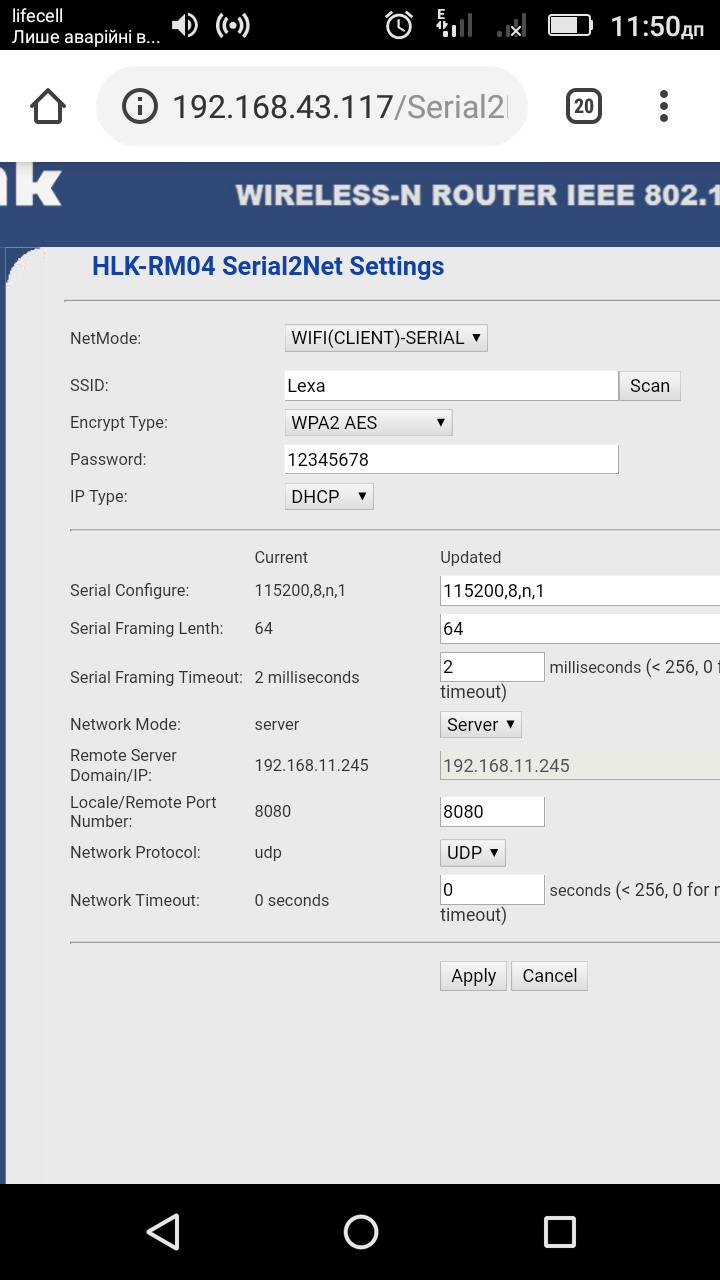 3. На странице конфигурации меняем NetMode: WIFI(CLIENT)-SERIAL, SSID: имя точки доступа телефона/планшета, Encrypt Type: WPA2AES, Password: пароль точки доступа телефона/планшета, IP Type: DHCP.