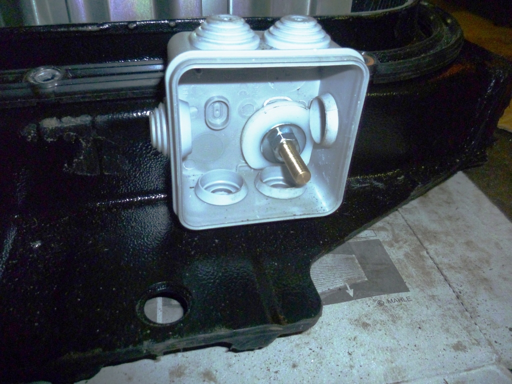 Тут медная шпилька проходит сквозь стальной ящик через второпластовые втулки с шайбами и снаружи входит в обычную монтажную коробку для наружных работ, естественно с применением силикона.