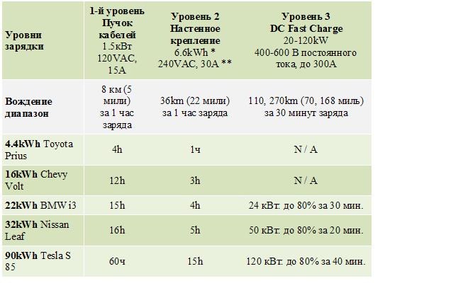 В таблице 3 приведены уровни и уровни заряда с уровнями 1, 2 и 3. Время зарядки может не полностью соответствовать рекламируемым тарифам, так как расчеты основаны на зарядке пустой батареи до полного SoC; некоторые производители электроэнергии считают аккумулятор заряженным, когда он достигает 80 процентов. Время зарядки также сокращается по мере того, как батарея исчезает, потому что меньше заполнять.