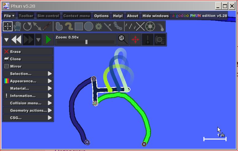 Как видим, два нижних подшипника закреплены, еще два подшипника соединяют три железяки между собой (их не погнуло, я их специально кривыми рисовал), и на отростке третьей железки три точки рисуют траектории движения. Картинка родилось в течении часа освоения методом антинаучного тыка. Причем самый кайф толкать конструкцию и смотреть как оно само колбасится. Качал тута http://mistakes.ru/download/algodoo_phun_game Приятного времяпровождения