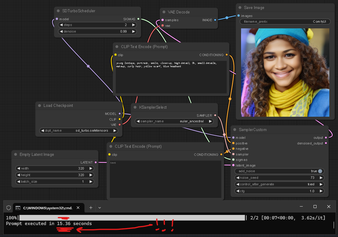 Картинки 512х512 малює за 2,5 секунди в чотири кроки. А картинку 2048х2048 в чотири кроки зафігачило за 3,5 хвилини, що