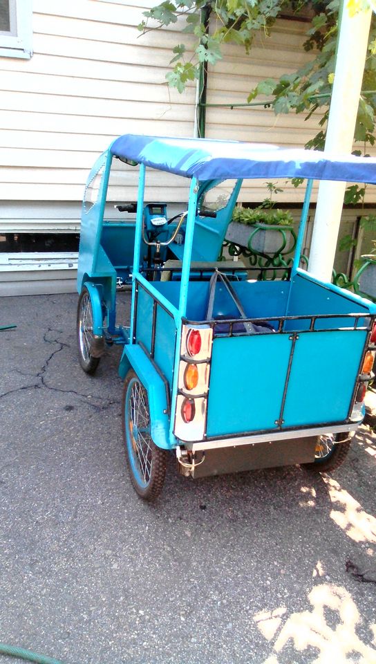Всем здравствуйте! Как и обещал , сегодня ровно два месяца регистрации на форуме, делаю отчёт о проделанной работе. :ups: :? Ну и закона подлости никто не отменял. :motz: Начало сыпаться , почти всё подряд , в доме - вода ,канализация, краны, насосная станция, ещё и лифт на профилактику напросился . Полный набор , я метался между неисправностями и проектом. :o Конечно не всё успел ,что планировал. :ups: :? Сделал перегородку , теперь у меня полноценный кузовок .Поставил брызговики, закрепил стопы, натянул крышу. Сегодня сделал тестовый выезд - маршрут тот же. Начальное напряжение 78,4 в , поездка в горку , на круизе , тапка в пол, 37 ватт час, с горки 26 ватт час , итого = 63 ватт час на 2, 5 км . Расход снизился в присутствии крыши. Откопал у себя старенький рабочий велокомп , но поставить не удалось, максималка пока тайна 8) . Выплыл существенный недостаток , я увеличил жёсткость передней подвески , теперь её не пробивает , но бьёт в обратку, когда проехал кочку. Надо ставить резиновый демпфер , чем сегодня и займусь {O_0} . Несколько фоток после теста.