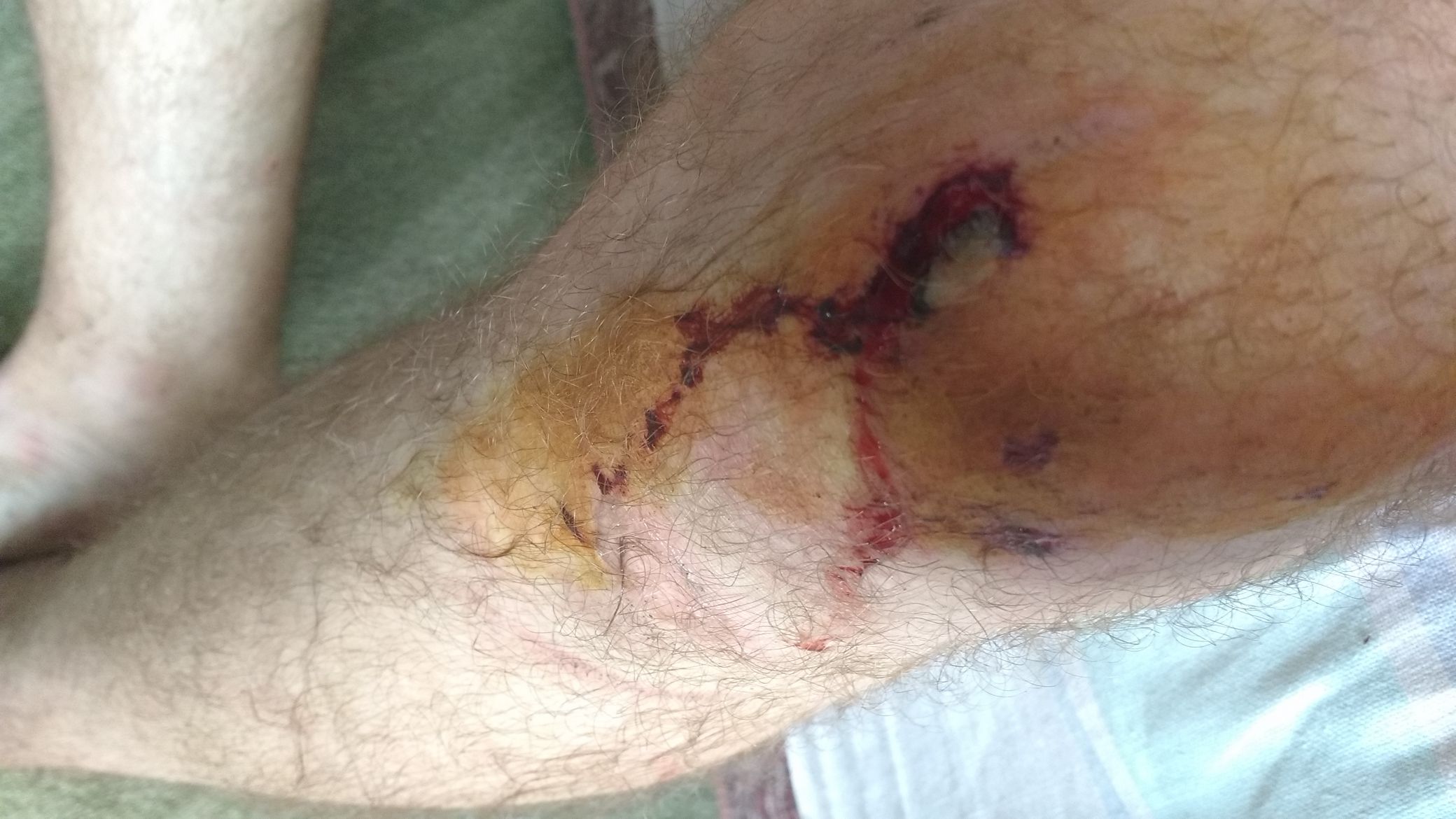 Как для такого падения я доволньо легко отделался. Лицо защитил козырек на шлеме, который многие снимают. Из повреждений лица - всего пару царапин на носу и порванная губа. Ноги-руки спас импровизированный экип из кучи слове одежды. В покатухе были температуры до +3градусов, поэтому одежды на мне было много. Штаны порвались.