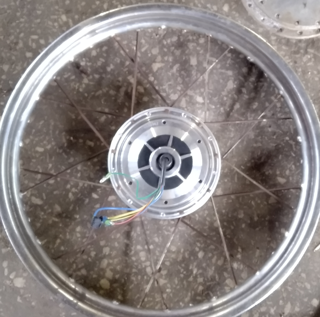 Приобрел третий мотор в переднее колесо. А также колесо от минского мотоцикла на 18 дюймов. Хотел сразу полностью вилку от Минска поставить, но она тяжеленная выходит, вес как у всего остального. Прикинул, что колесо войдёт в веловилку, с небольшими доработками. Диаметр мотоциклетной ступицы немного больше диаметра мотора, попробовал заспицевать родными старыми спицами, но не в два креста, а в один. Вроде должно хватить длины спиц. Заказал у Евгения LiFePo4, уже едут, бо из китая устал ждать, да и то, что приходит зачастую низкого качества. В последний раз один из аккумуляторов пришел в ноль разряженным, мучаю его зарядами разрядами, первый раз отдал 4,2, второй 4,1, третий 4 ач, похоже ему уже ничем не поможешь. Или изначально китаец положил бракованный или его так убил пересаморазряд.