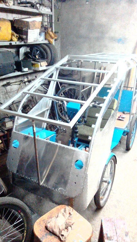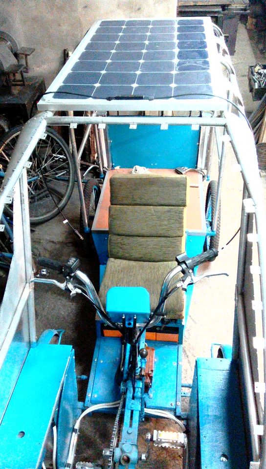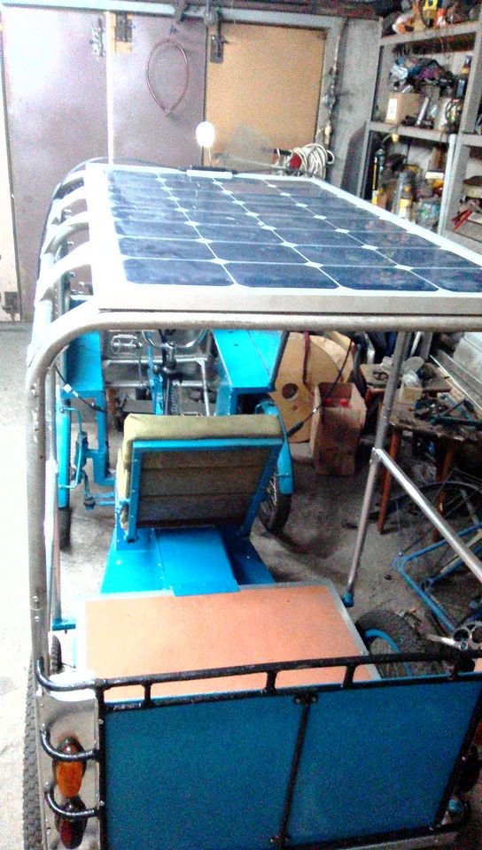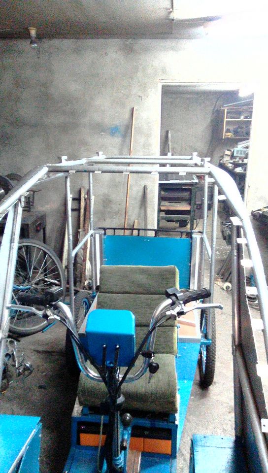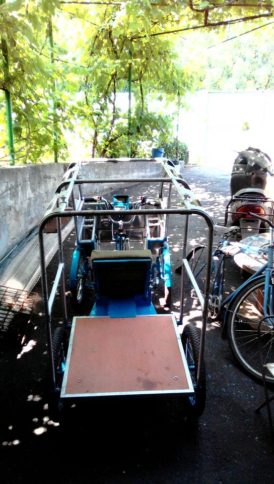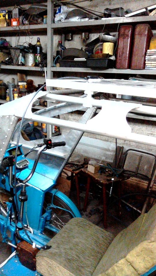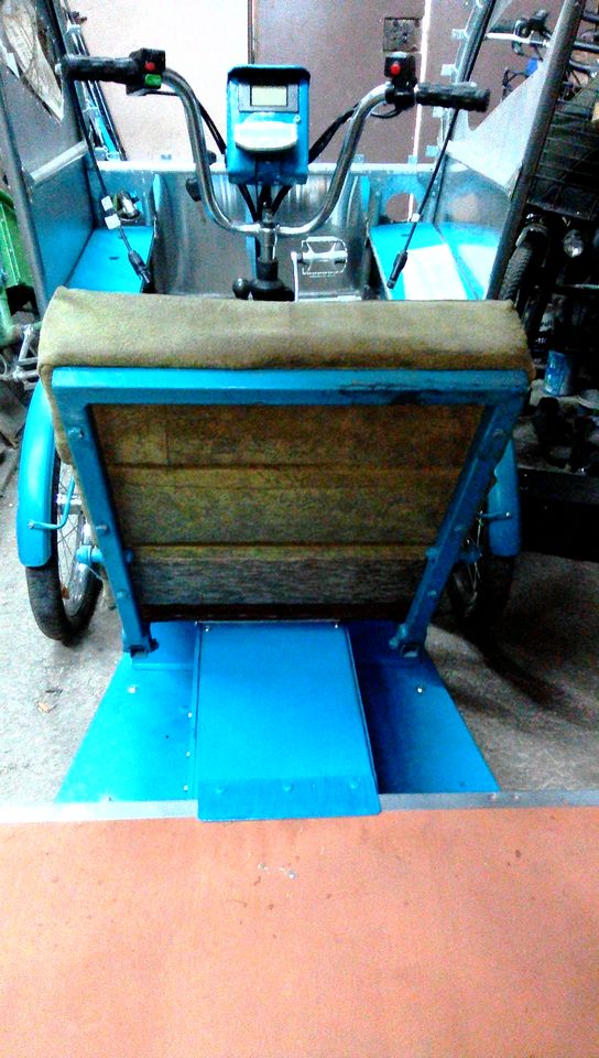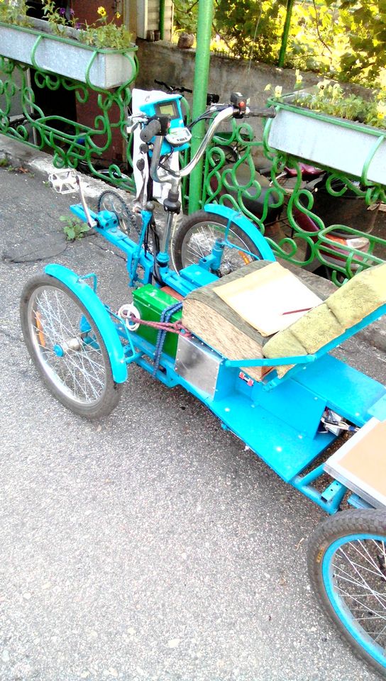 ( так вот для чего они нужны ) Вскрываю панель приборов , точно в разъёме один пин , брак , соединяю на прямую . Передёргиваю батарейку в велокомпе ,ожил ,на холостых показал 40 км час, близкую к расчётной. Выезжаю , всё работает , кроме велокомпа ,требует батарейку , ну где я ему в поле её найду. Доехал до участка , поднялся ветерок, проехал ,туда и обратно на круизе. Результат- с горки и поветру 21 ватт , назад 40 ватт , и того 61 ,на примерно 4 км. Максималка примерно 35 +. Сегодня куплю батарейку завтра повторный выезд. Но самое интересное началось потом , приблизившись к дому , решил испытать по полной контроллер на 72 в. Остановился и дал резкий старт. Я был ошарашен , разгон ,что у моей хонды , аж в кресло вжимает ,на амперметре 66 А , циферки мощи перепрыгнули 3 квт. , а шунт то 50 А. , врёт наверное , НО по сравнению с двумя пятисотками , бомба. А они у меня пишут 30 А , каждая. Я раз 6 стартовал , потом опомнился , потрагал движки , заметно прогрелись, до этого после всех покатушек еле тёплые были.Вот в таком виде я ездил.