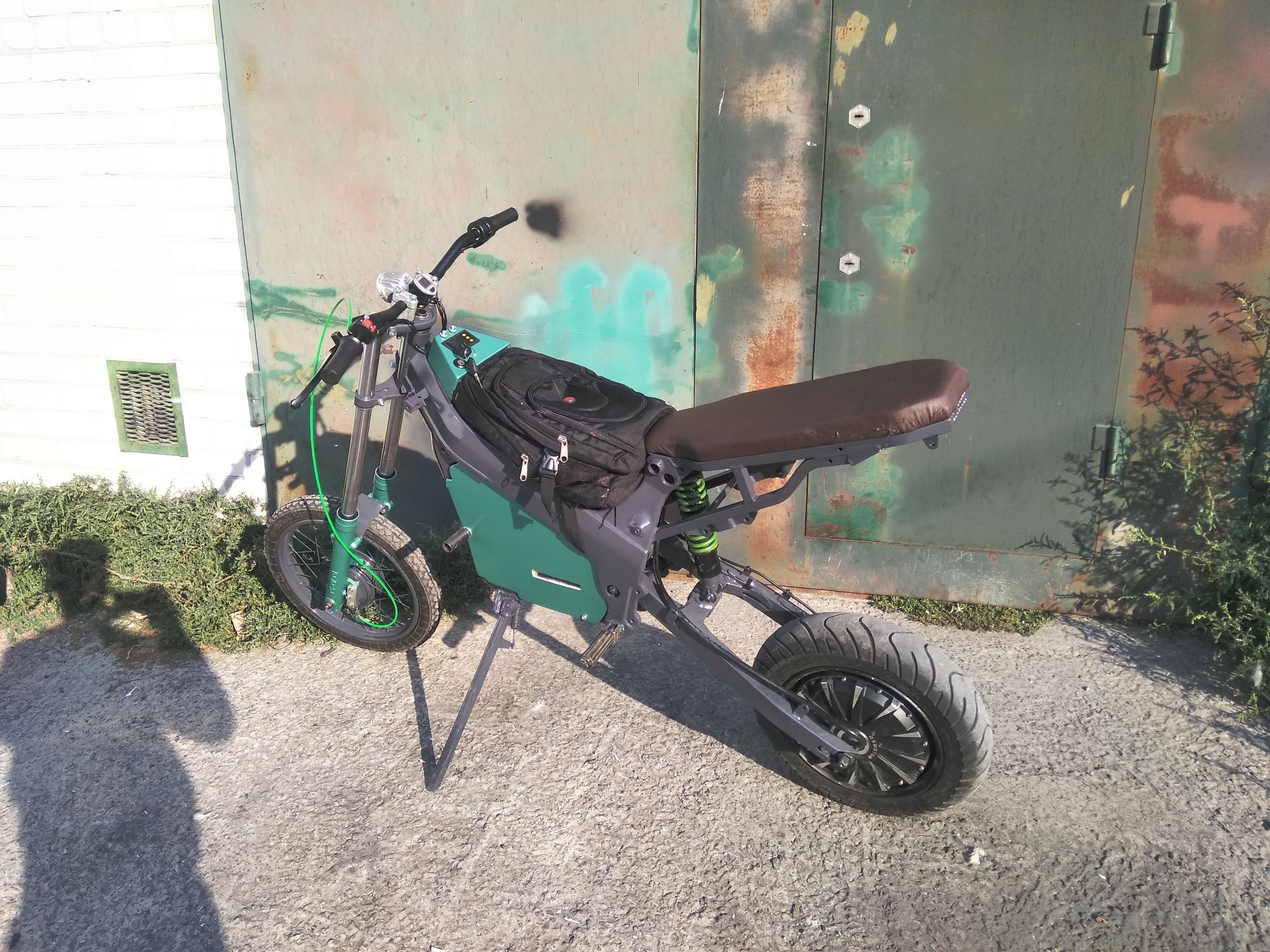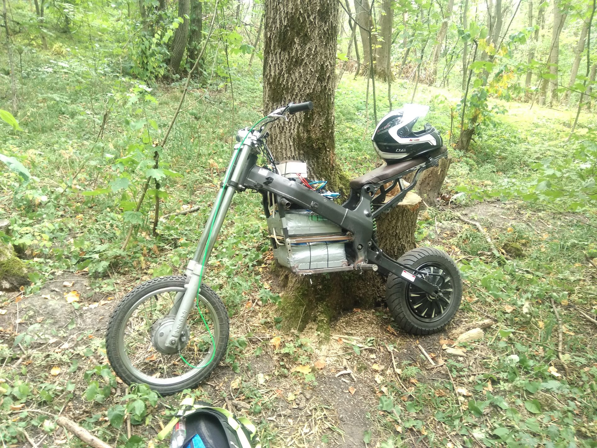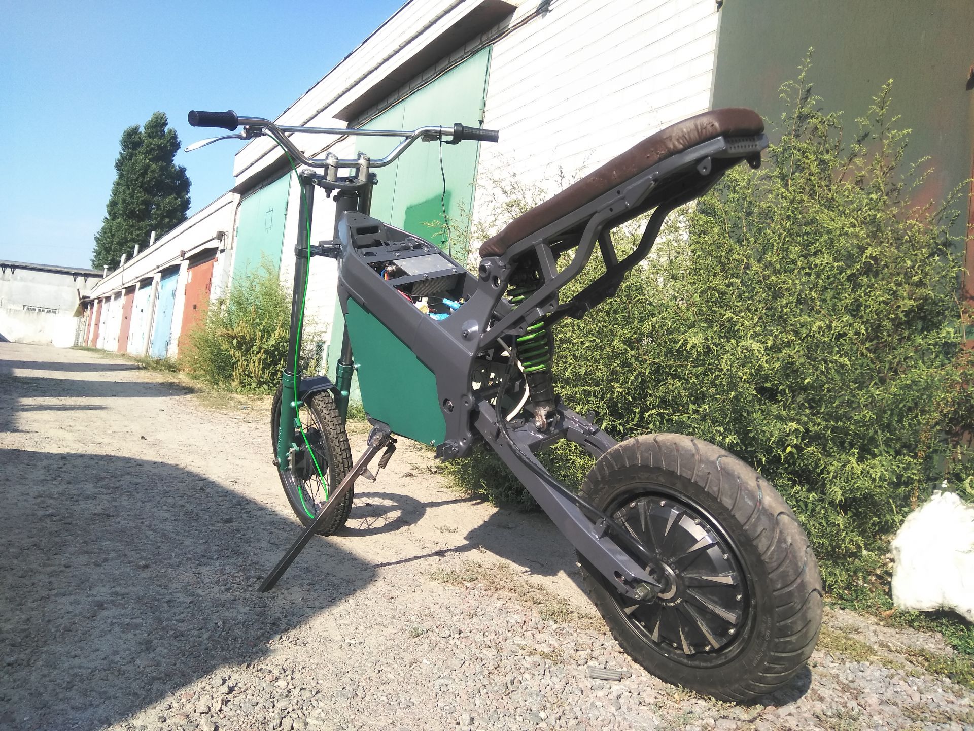 Сегодня были первые покатухи по городу. Точне первые были на прошлых выходных, но не было ещё зарядки, тормозил рекуперацией при отпускании газа и накатал всего 10км. Сейчас убрал плохие соединения в проводке, от батарейки идут провода на 25мм². Стоит один автомат на включение мозгов контроллера и от него резистор на заряд конденсаторов силовой части, на силовую часть отдельно автомат на 125А и один автомат на свет и ваттметр. Пока ещё обкатываю, выявляю основные косяки конструкции, что-то допиливаю. Потому и не покрашен. Вывел ещё кнопку на руль на включение рекуперации/тормоза и сделал чтоб он мог при отпускании ручки газа накатом идти.