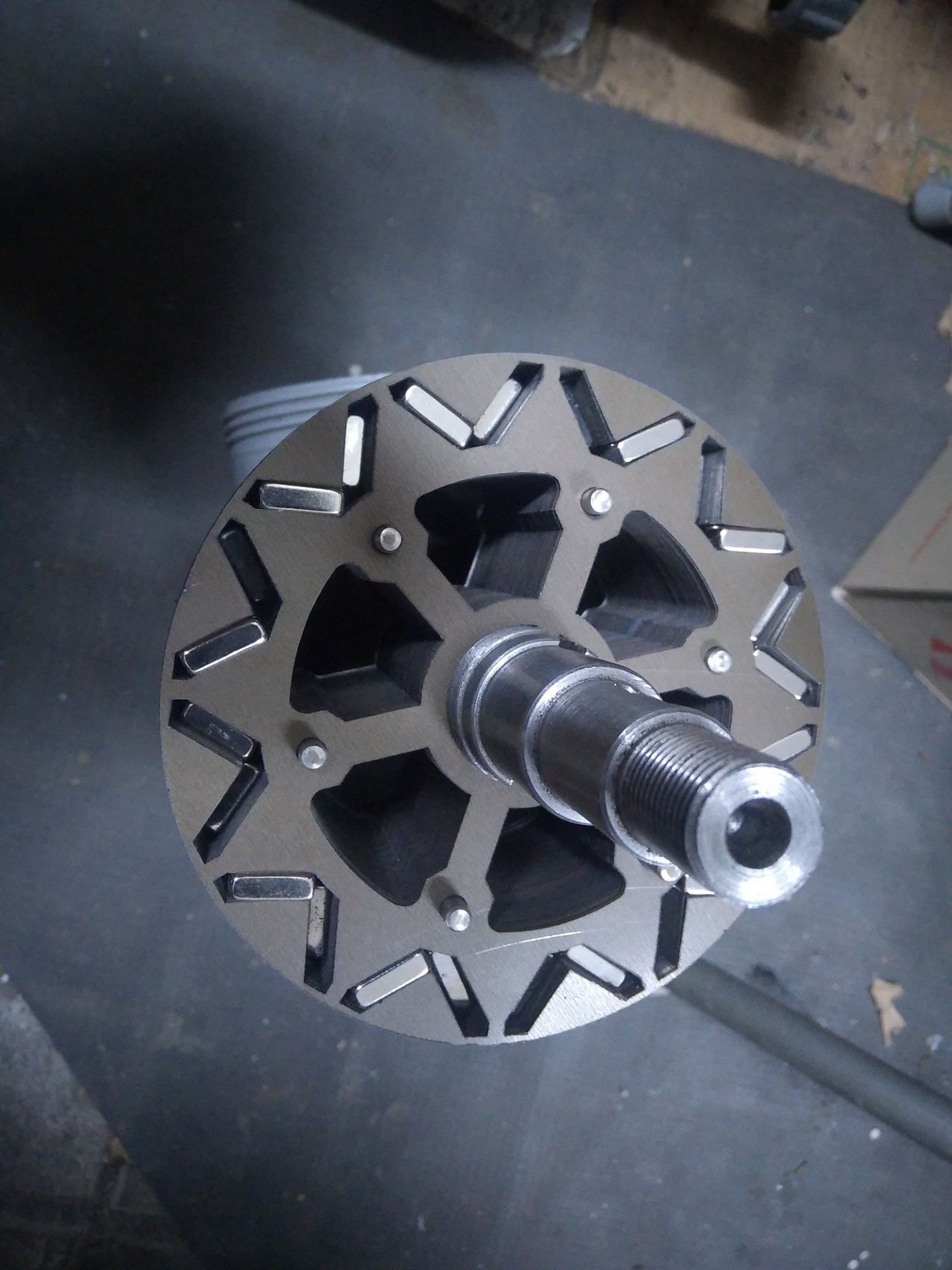 Давно сюда не заглядывал.. В общем покатался я на моцыке, протестировал мотор и понял, что всё печально. Сильно греется ротор, 60 градусов и более, а там и до размагничивания магнитов недалеко. Принял решение делать новый ротор, причём типа IPM, с магнитами внутри. Работа шла не так быстро, как хотелось бы, но я не отступал от намеченной цели. На данный момент мотор закончен и обкатан - результат мне нравится :) Немного фоток: