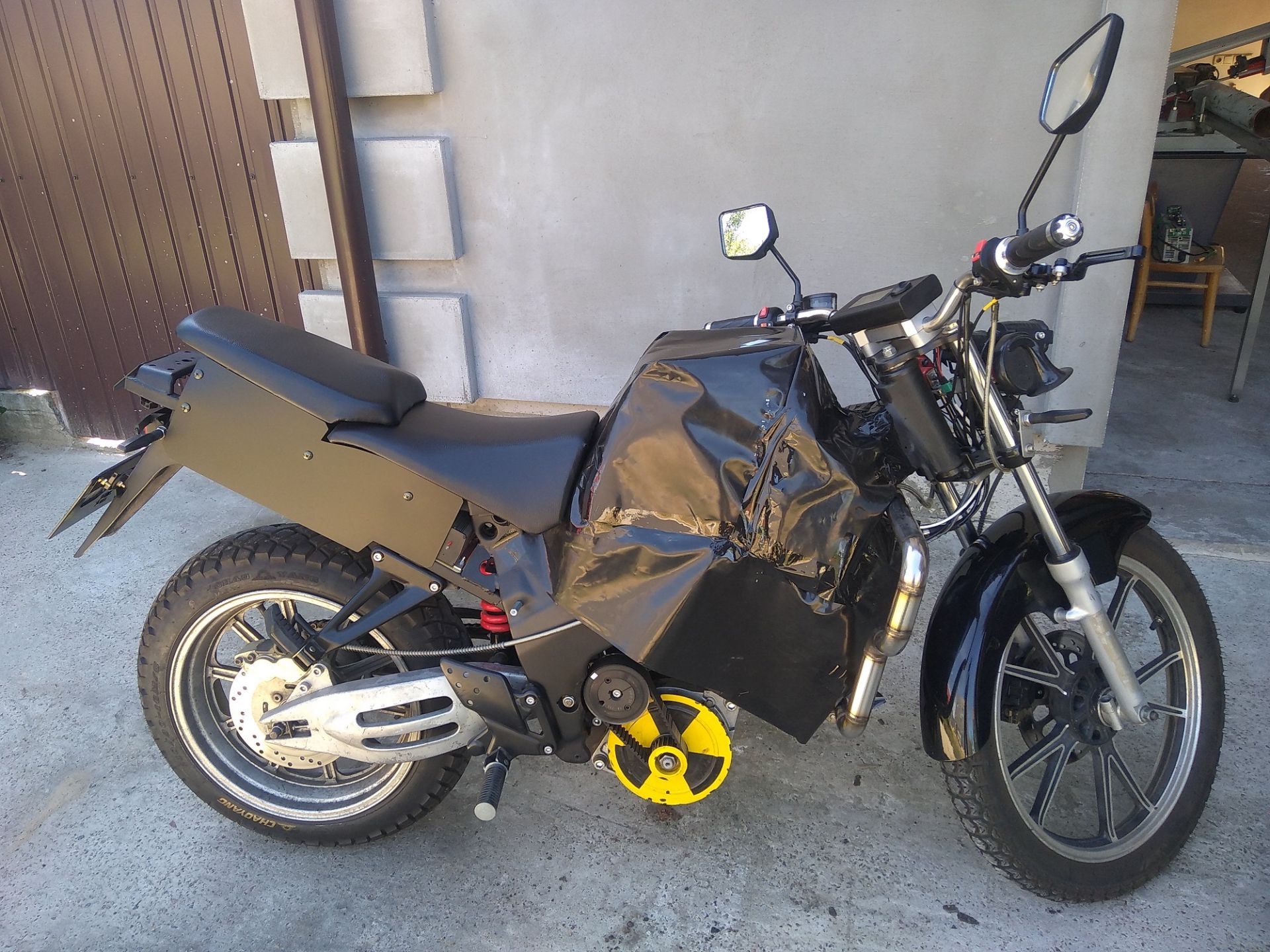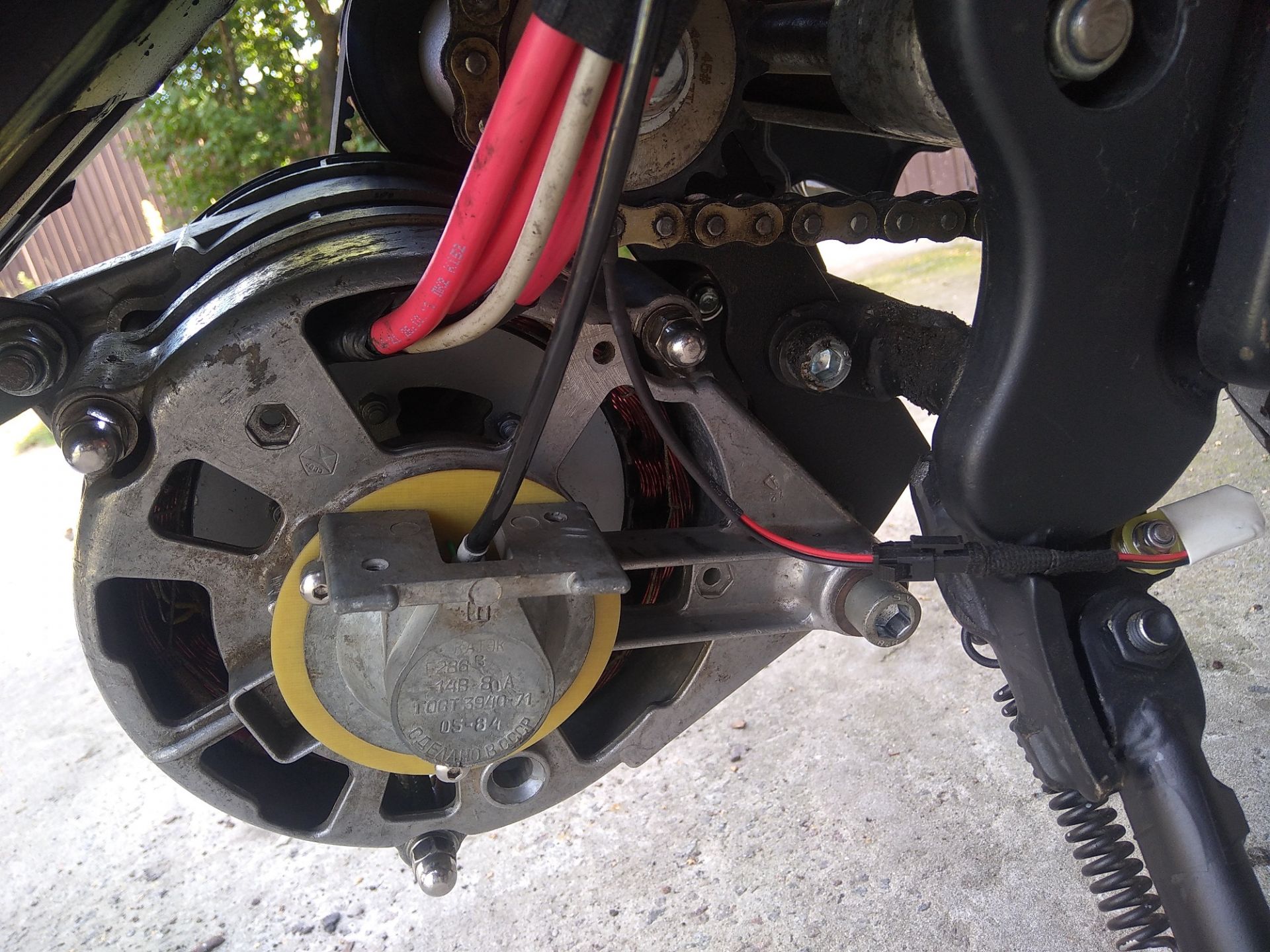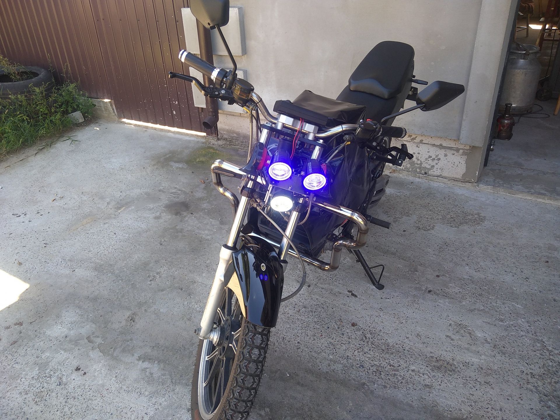 Отдельное спасибо Виталию Брызгалову (SRmotor) за помощь с порезкой пластин ротора! Ток ХХ мотора - 7А, что меньше, чем у QS138 (8A). Однако, и обороты меньше, всего 3200, и это при обмотке 4 витка :( При редукции 4,17 (38/22 * 41/17) моцык едет макс. 80 км/ч. Но едет очень бодро, и главное - никакого нагрева ротора, да и статор еле греется. Хотелось бы конечно скорость поболее, но пока остановлюсь на достигнутом. Чего-то нет желания опять перематывать статор или менять редукцию.. Думаю, для города будет норм. Сделал защитные дуги, осталось полирнуть. А вот с обвесом пока никак..