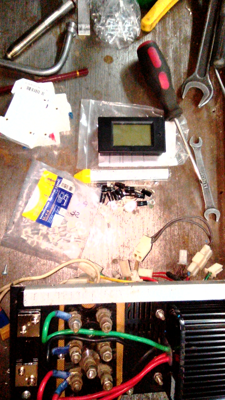 Ну , а сегодня ,с новыми силами , взялся за проект- попаял перемычки на аккумуляторы , продёрнул проводку, подключил контроллер на 72в. , накинул двигатели ( на попробывать ) , вывесил задние колёса, подключил ручку газа и кнопку круиз контроля. Включил автомат.