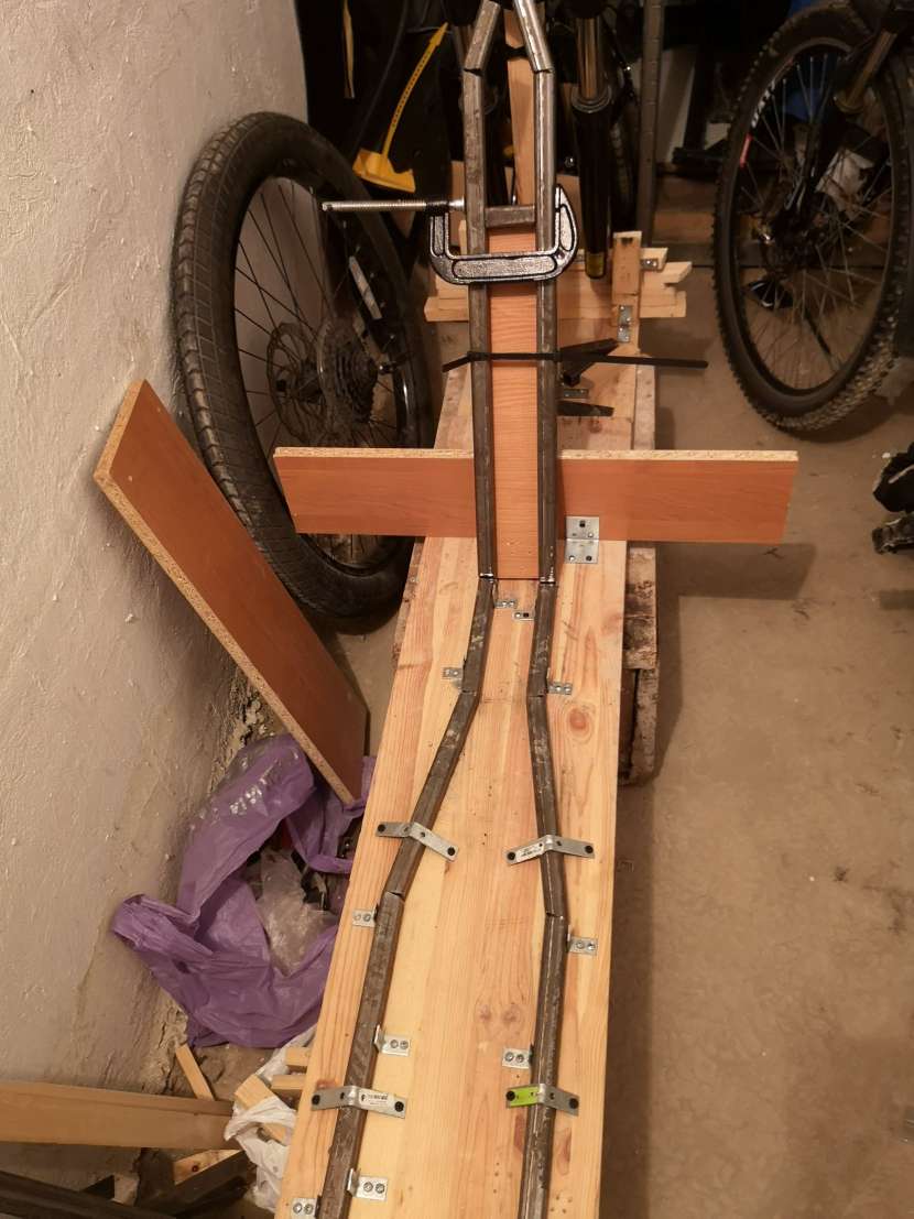 После неудачной попытки сварить трубы на коленке, решил пойти простым путем, минимальное количество труб и сварки, поэтому просто взял 2 профильные трубы и с помощью ножовки делал надпилы и загибы и из двух параллельных труб набросал основу новой рамы. Как всегда все на коленке с помощью досок и саморезов. Решил пойти по простому пути и собирать хардтейл, как изначально и планировал.