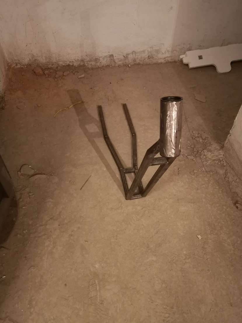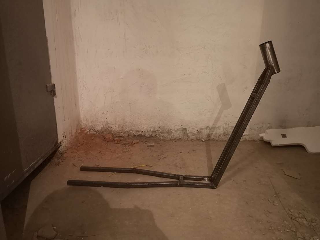 Нашел даже недалеко от дома цех где занимаются обработкай металла (в том числе и сваркой) там и приварили мне все что я набросал полуавтоматом и соединили со стаканом. Я уж обрадовался, думал что наконец-то есть основа, а дальше уже можно будет вокруг нее доваривать верхние трубы и т.д. Но я слишком коротко отрезал трубы и получился слишком острый угол, с которым руль нормально не крутится, педали просто упираются в переднее колесо и геометрия просто никакая.