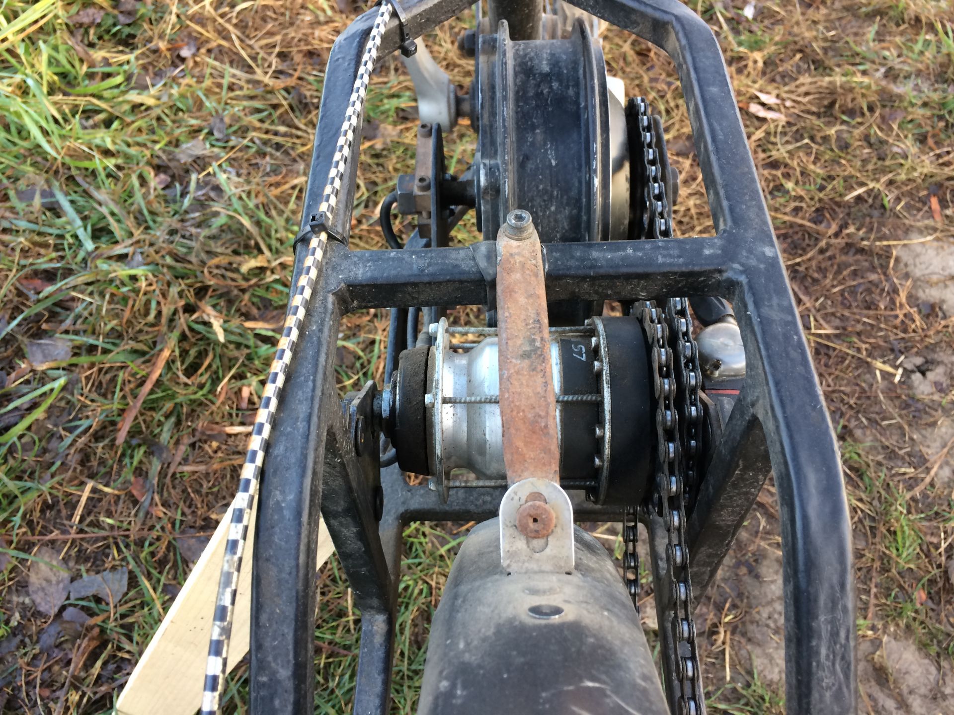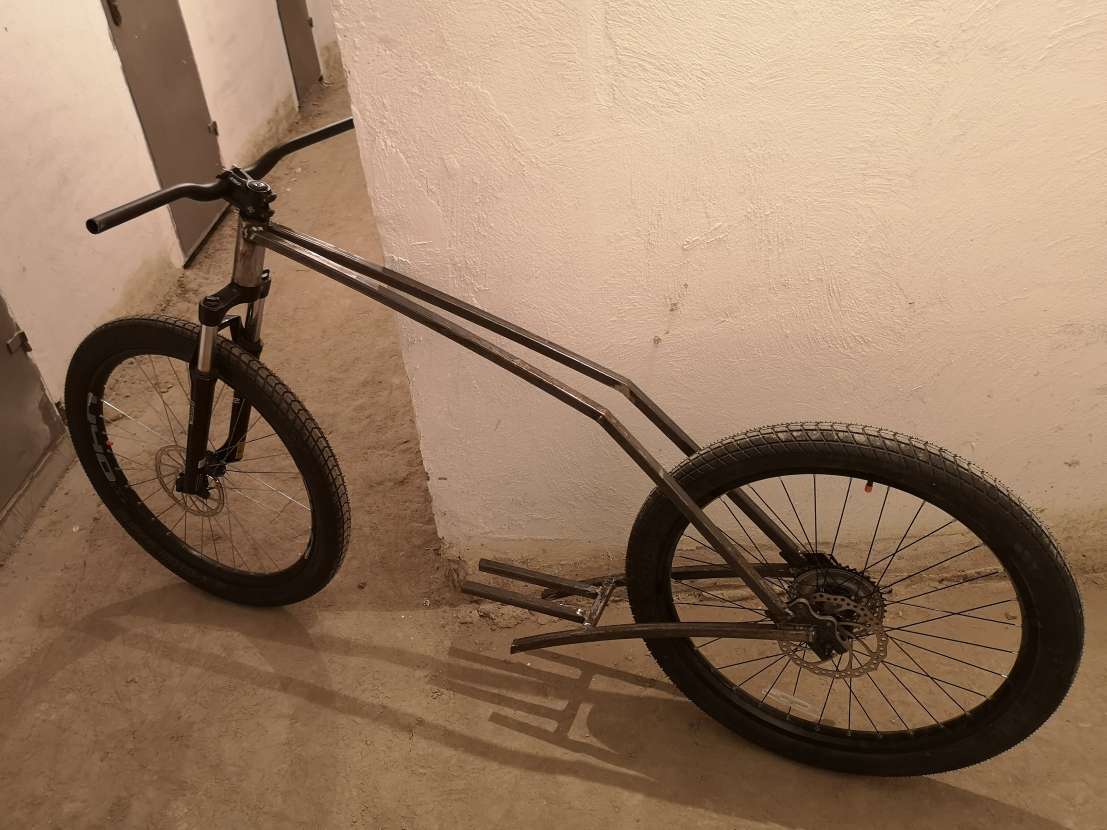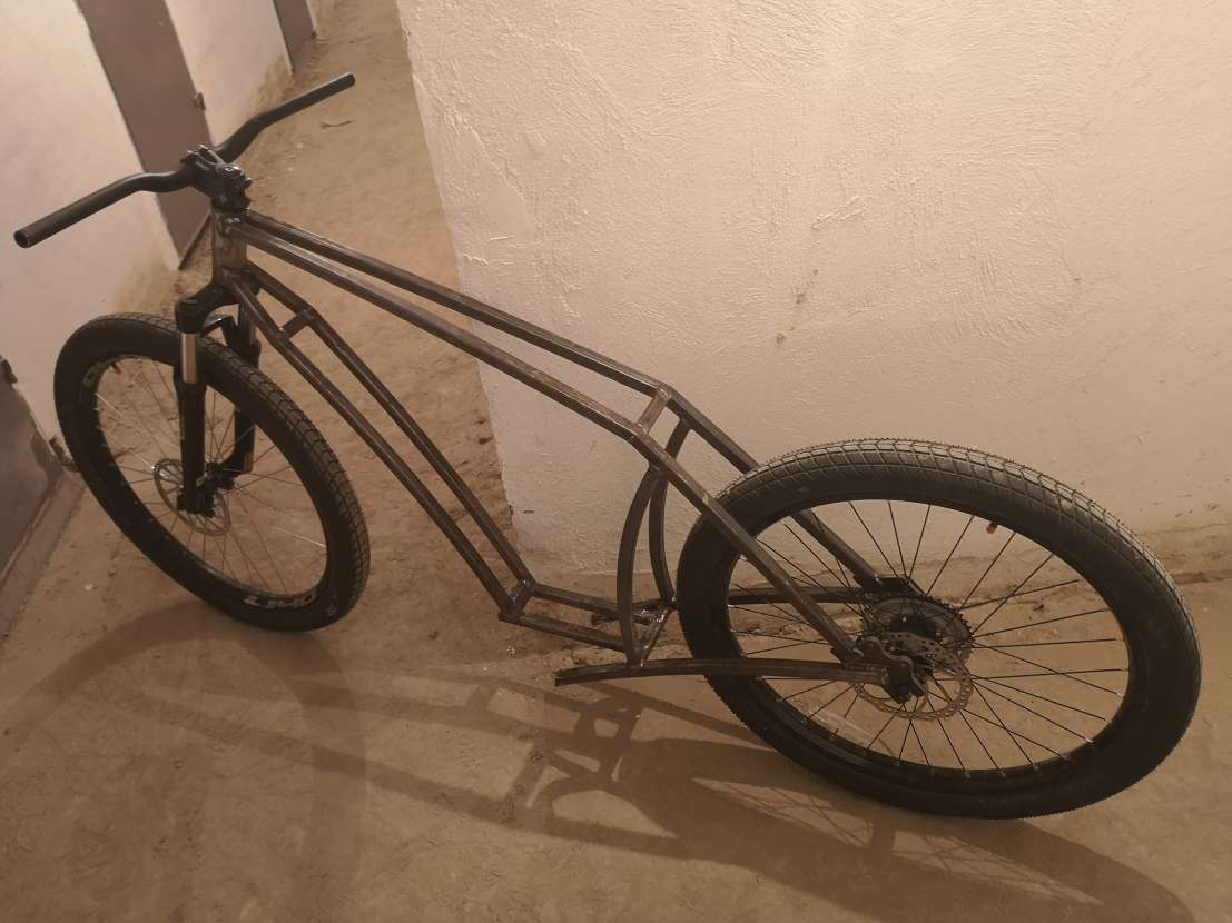 Доварили мне основной каркас рамы, на удивление получилось на глаз даже относительно ровно, учитывая что нарезались и ставились трубы тоже почти на глаз, как и весь проект в целом, то я доволен. Позже посрезаю лишнее и позачищаю. Длина получилась около 2м, как я и ожидал, угол рулевой около 68, как на мтб, точно сложно понять так как в подвале не очень ровный пол. Дальше планирую приварить дропауты пром вала, с которого будет идти цепь на заднее колесо и каретку, а уже после дропауты для мотора, чтоб педали не цеплялись за ось мотора. В общем осталось самое функциональное. Нужно еще лазером нарезать 2 диска для крепления звезд, для нужного передаточного отношения ведущие звезды будут 22Т, еще нужно найти под них бонки, а то у меня под больший диаметр. Ну и потом уже подумаю как лучше сиденье сделать
