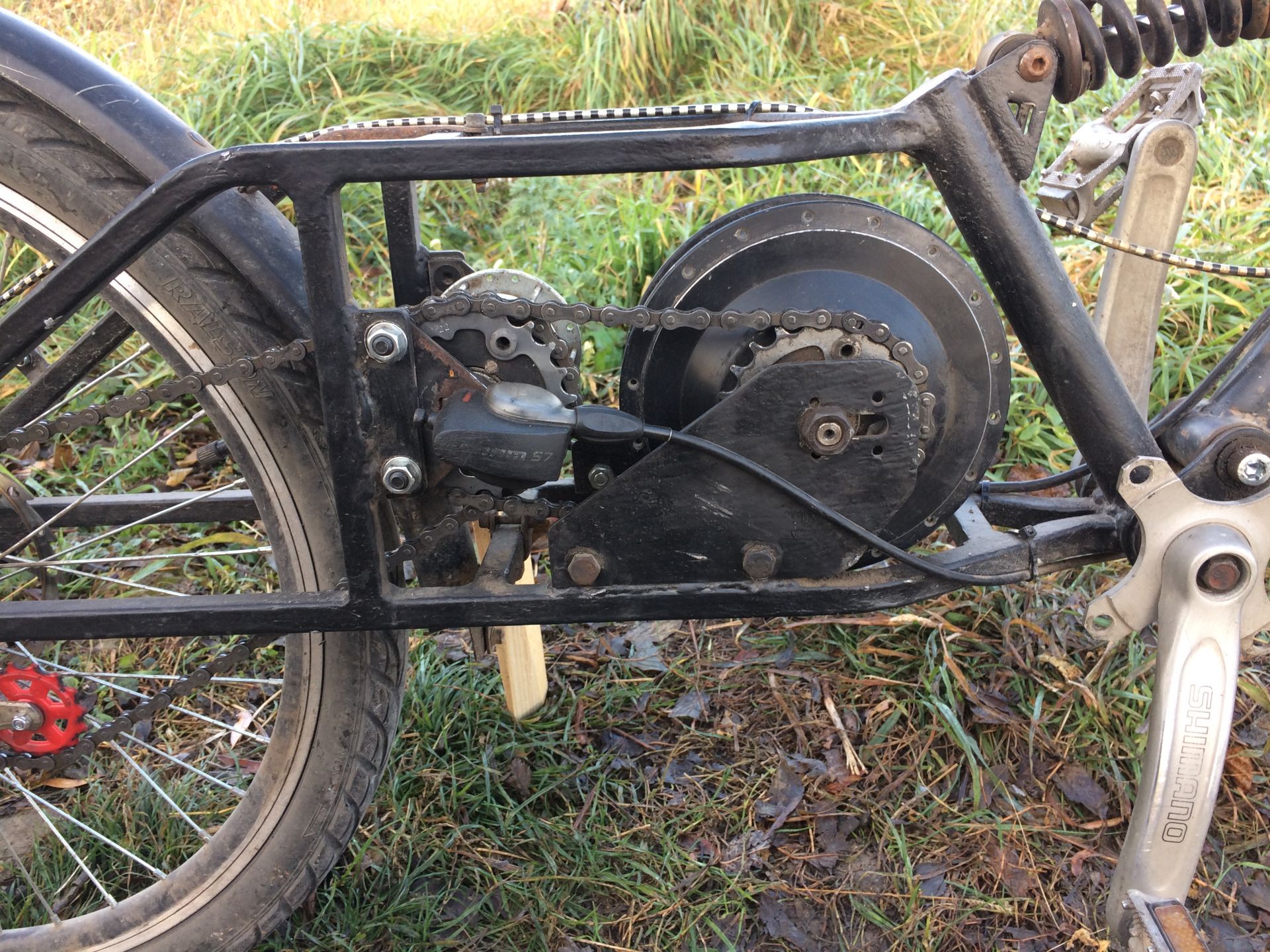 У меня схема похожая планируется, но с 3 цепями, так как еще хочу педальный привод. Вижу у вас ведомая от мотора 22т звезда, от обычных шатунов? Как раз ищу бонки для такой же звезды, планирую ее в качестве ведущей с мотора. А к мотору как закрепили зведу?