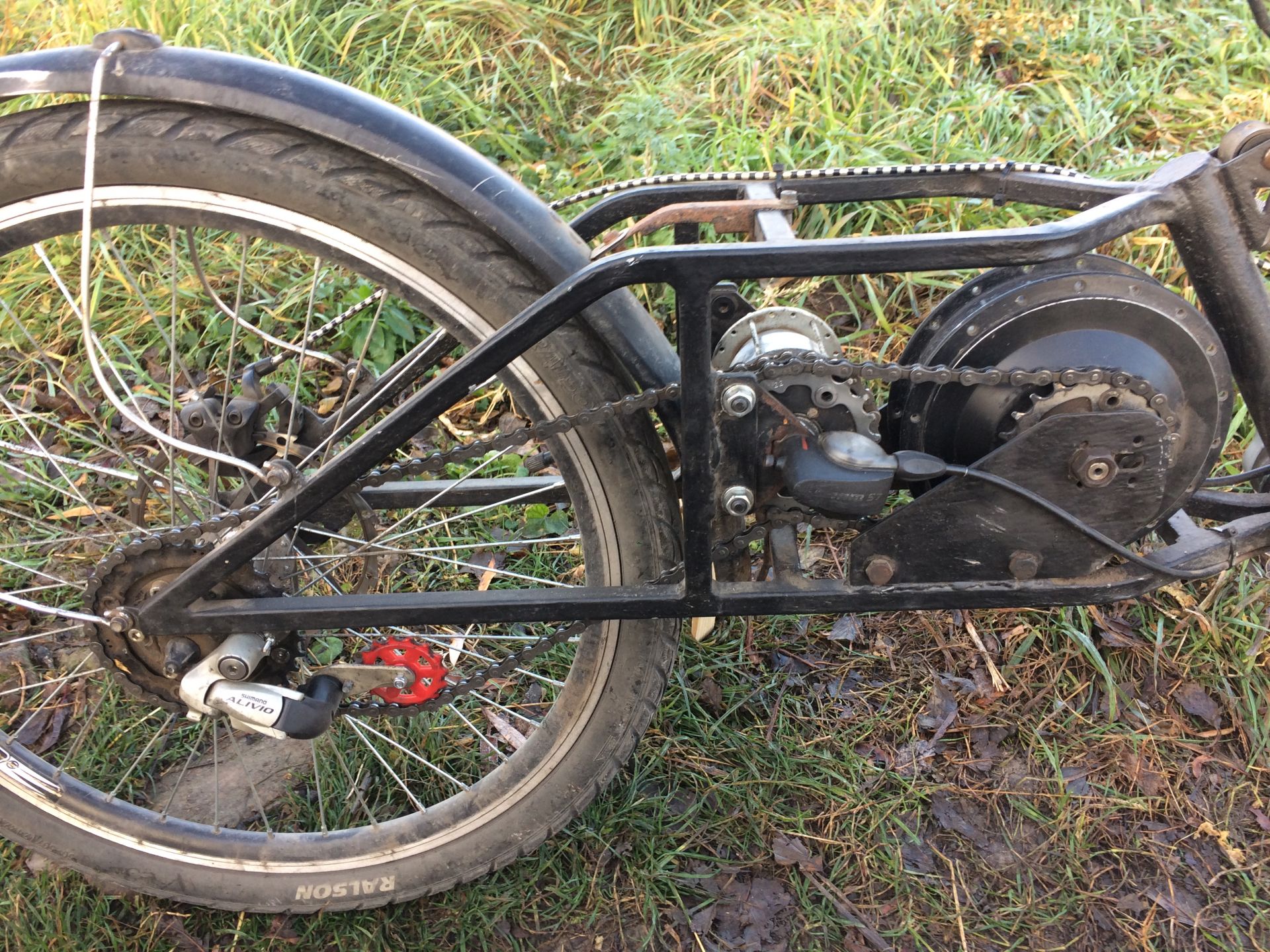 Не прошло и полугода как почти доделал маятник(осталось придумать как обшить,чтобы грязь не летела).Обгонка заварена в моторе.В таком исполнении цепей KMC Z7(Z51 в старину),звезд Shimano простых,не топовых,хватает на примерно 2500км,или до полного убивания 3200км и более,все зависит от качества натяжителя цепи.Из токарных робот только переходники для звезд на планетарку.Педалей нет совсем ибо в таком исполнении они не нужны(как подножки и только),хотя в моей конструкции можно сделать и педальный привод.В горку 25 градусов вытягивает на еле теплом моторе и контроллере градусов под 45.Контроллер стоит на 17 ампер(аля 350 ват).Аккумуляторы минимонстры 14го года с используемой емкостью в 11 а/ч(сколько в них есть реально не знаю ибо задушен по верху и низу в угоду ресурса)вес акума 6 кг.Транспортное средство эксплуатируется круглогодично в любую погоду с 18года июня месяца.Аккумулятора хватает на 28-30 км по городу и 32-35 на трассе со средней скоростью 32 км/ч. Живу в Хмельницком в самом городе,горбов хватает,средний расход около 15 ват/км.Если есть вопросы по моему тс отвечу.
