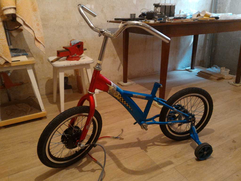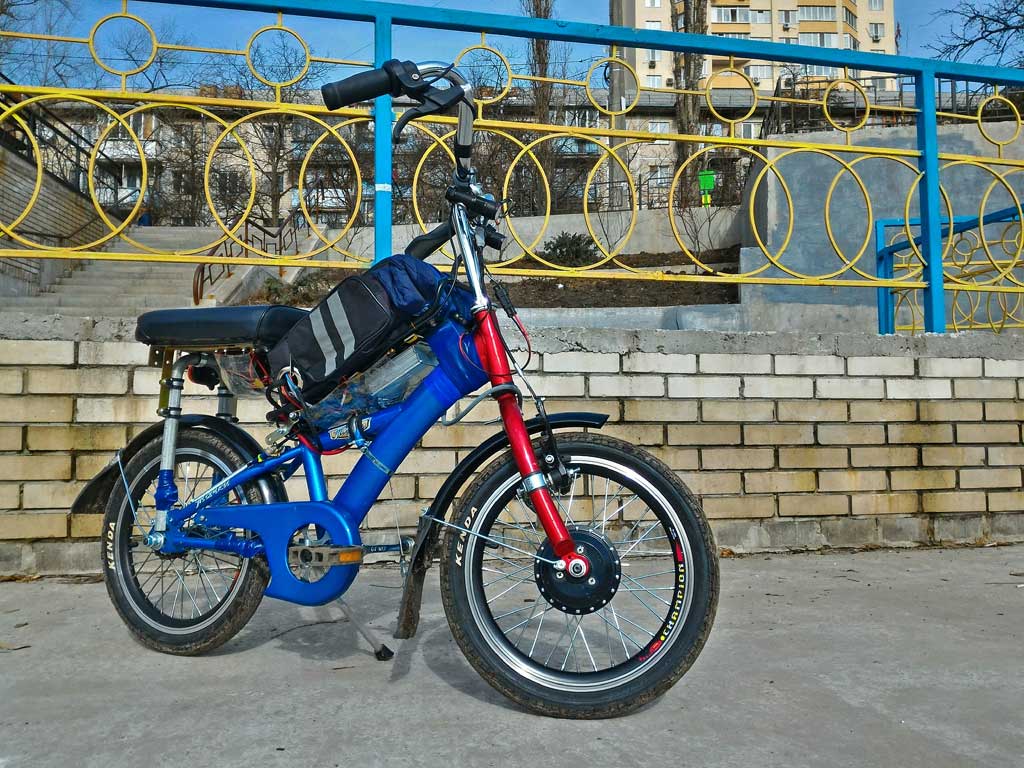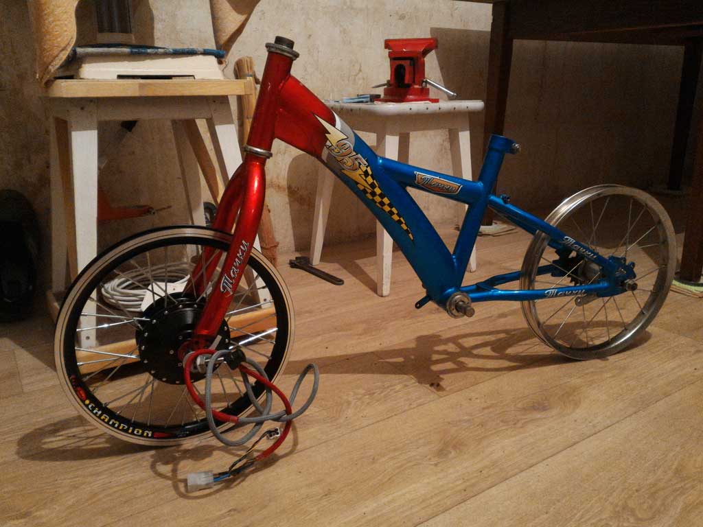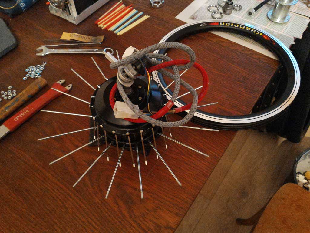 Новые колеса спицевал из отдельно купленных деталей - алюминиевые 16-дюймовые обода, спицы толщиной 2,6мм. Поставил спереди 350-ваттный редукторный мини-мотор (снял со своего предыдущего электровелосипеда, так что, тут было без выбора). Кстати, из всех колес, которые я когда-либо спицевал, это набрать было сложнее всего. Батарея литий-ионная - 14-баночная сборка из 18650 на 10Ач, лежит в сумке на багажнике над рамой. Контроллер - 6-мосфетный Infineon, прошитый на минимальные настройки.