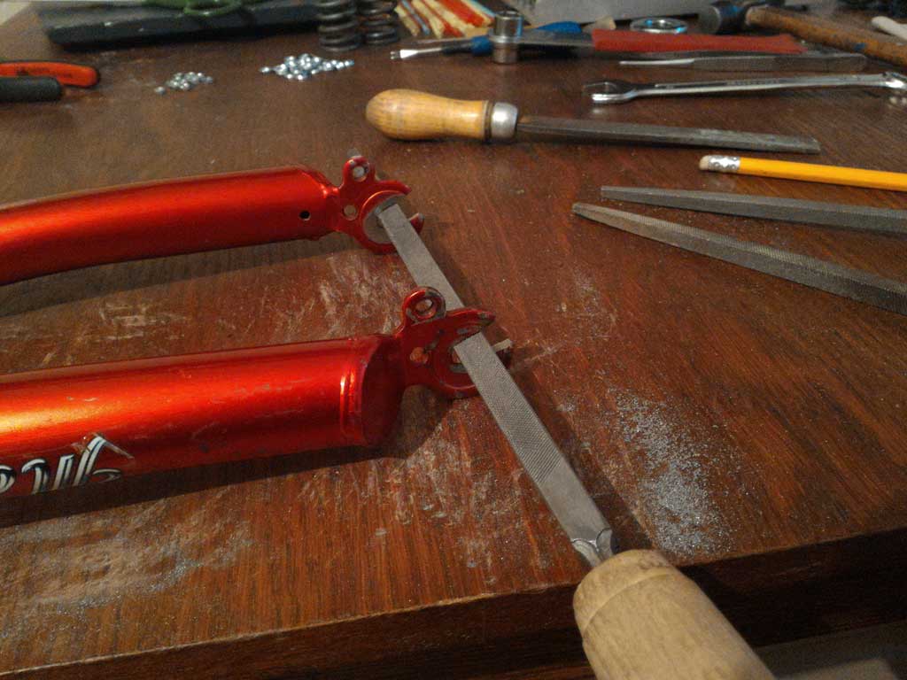 Нужно сказать, что этот вид транспорта "на любителя", подойдет далеко не всем, но для меня - в самый раз! В качестве прототипа я рассматривал американские олдскульные минибайки, которые мне нравятся уже много лет. Но поскольку с изготовлением рамы по моей задумке не сложилось, да и времени не было ждать, очень подходящим вариантом оказался велик для детей 4-7-летнего возраста, с названием в честь анимационного фильма «Тачки». От заводской комплектации в результате остались стальная рама с вилкой, подседел, шатуны и каретка. По поводу тормозов - в штатном варианте за вилку на одном болте держался какой-то клещевой макет тормозов, который я, естественно демонтировал. А чтобы поставить вибрейки, пришлось взять два силовых хомута, нарезать в них резьбу М6 вместо М5, заменить стяжные болты более длинными и прочными. Потом я взял накатные гайки-блинчики, просверлил в них отверстия для входа пружинок, накрутил на болты, зафиксировал вибрейки гайками Эрикссона и поверх них ещё самоконтрящимися гайками. Короче, после регулировки тормозит такая система на уровне заводской. Руль выбрал от велика Украина, вынос аистовский. Сиденье взял от мопеда Дельты, после которого к вело-седлу уже точно не вернусь