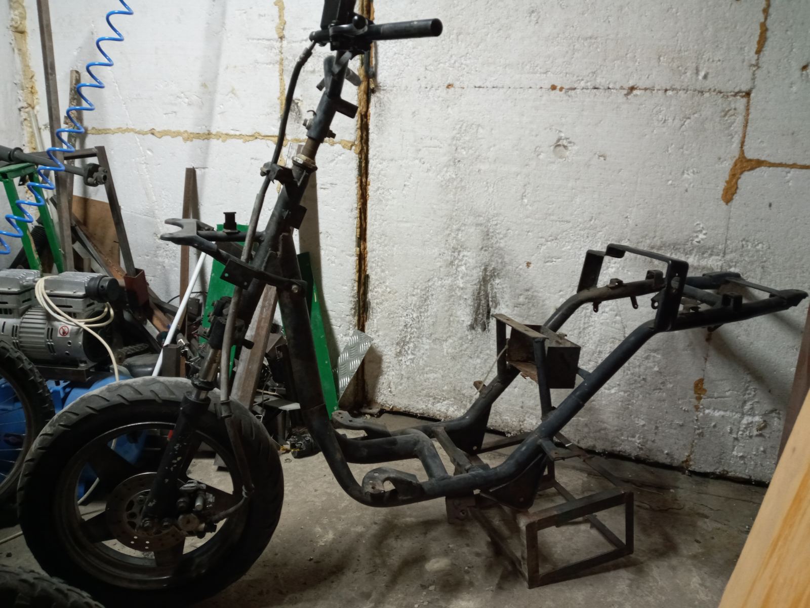 При изготовлении использовалась только сварка и болгарка, из станков использовался только самодельный сверлильный станок. Ну и применено большое количество профессиональной синей изоленты, благодаря которой это все ездит.