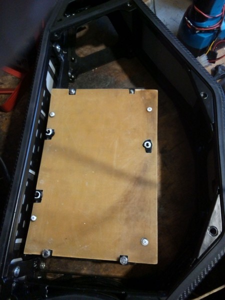 Після закріплення треба було чимось закрити струмоведучі частини. Знайшов на горищі шмат склотекстоліту - чудовий матеріал, тонкий і міцний! В пластиковій основі акумулятора були якісь отвори, закрутив туди саморізи. Щоб розмітити отвори під саморізи, я їх закрутив на місця, помазав головки коректором (тим що двійки в щоденнику замальовують) і приклав пластину. Пази під кріплення батареї і інші виступаючі частини вирізав електролобзиком, зажавши його ногами.