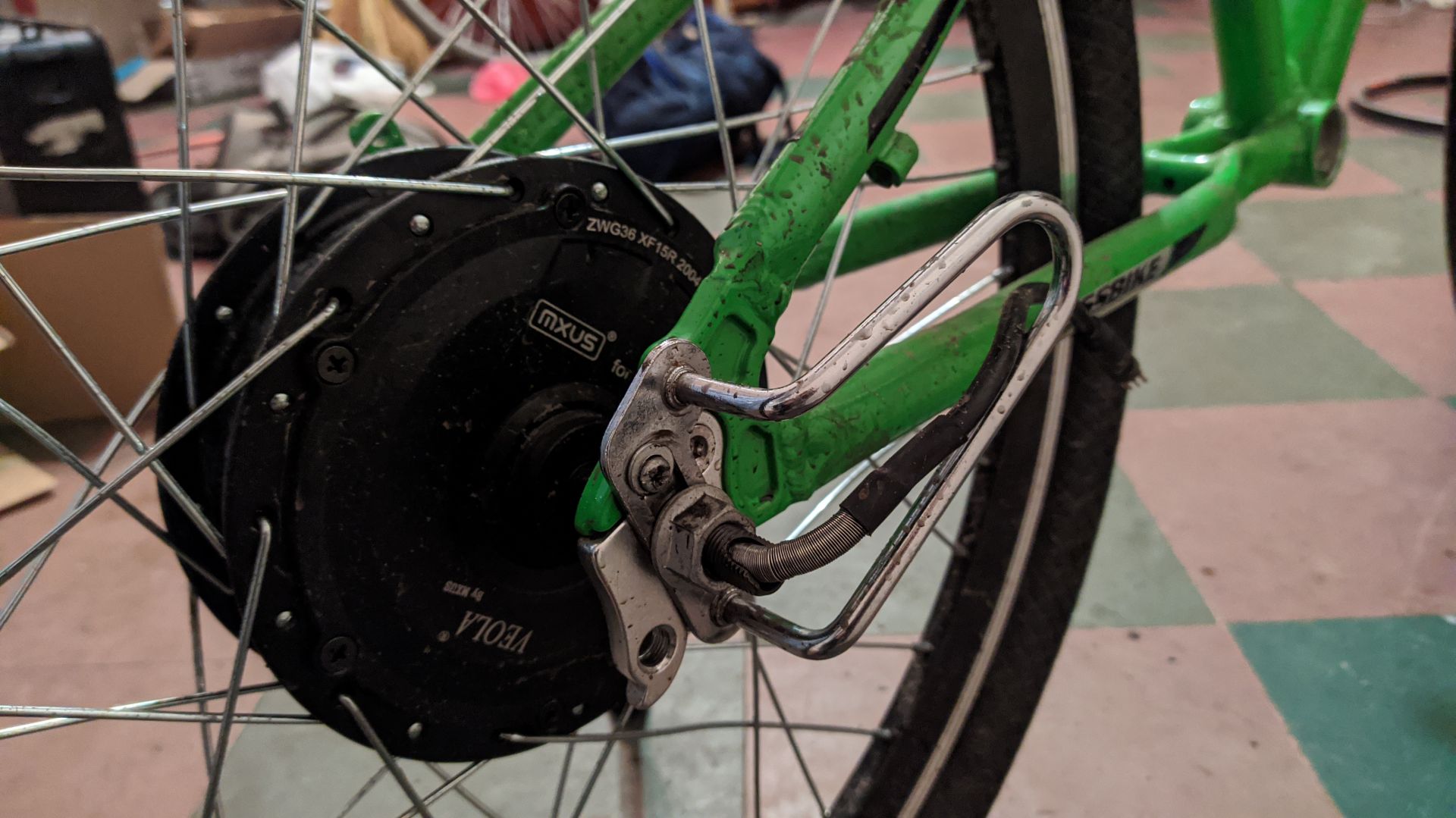 Задним колесом был выбран MXUS XF15 В версии на 36 вольт. Заспицованное в 24" обод - 50км\ч на холостых оборотах (52в).