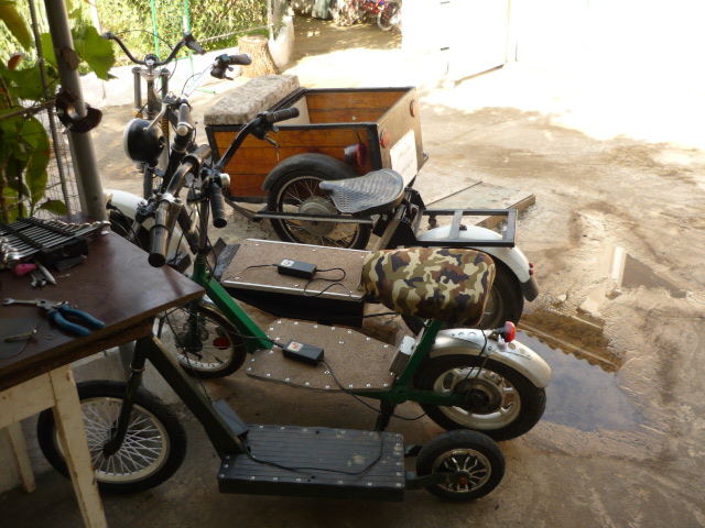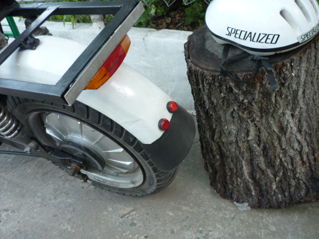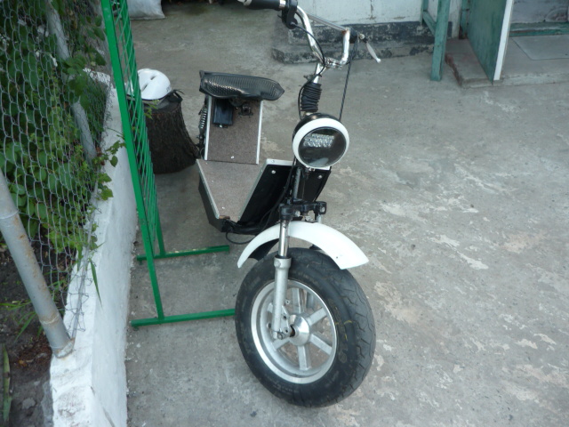 Прошла неделя с момента продажи моего самоката "Иваан Кожедуб" и "зачесалось" из хлама, без дела лежащего, создать еще что нибудь электро-само-ездящее... За основу взял остатки от скутера - это передок от рамы с вилкой. С рамы было срезано всё что по моему мнению "утяжеляет конструкцию" и "не пригодится"... На разборке приобрел переднее колесо 12" с покрышкой. Мотор-колесо было куплено "по случаю" на ОЛХсе пару лет назад. Родной его цвет - зеленый. Покрасил чтобы было одинаково... Было оно с вилкой и стоило аж 1000 гривен, поэтому как "истинный фанат шары" не смог "пройти мимо".... Вот и настал его черед. Не знаю что это за колесо (если кто знает-подскажите) и какой оно мощности....Но рабочее.