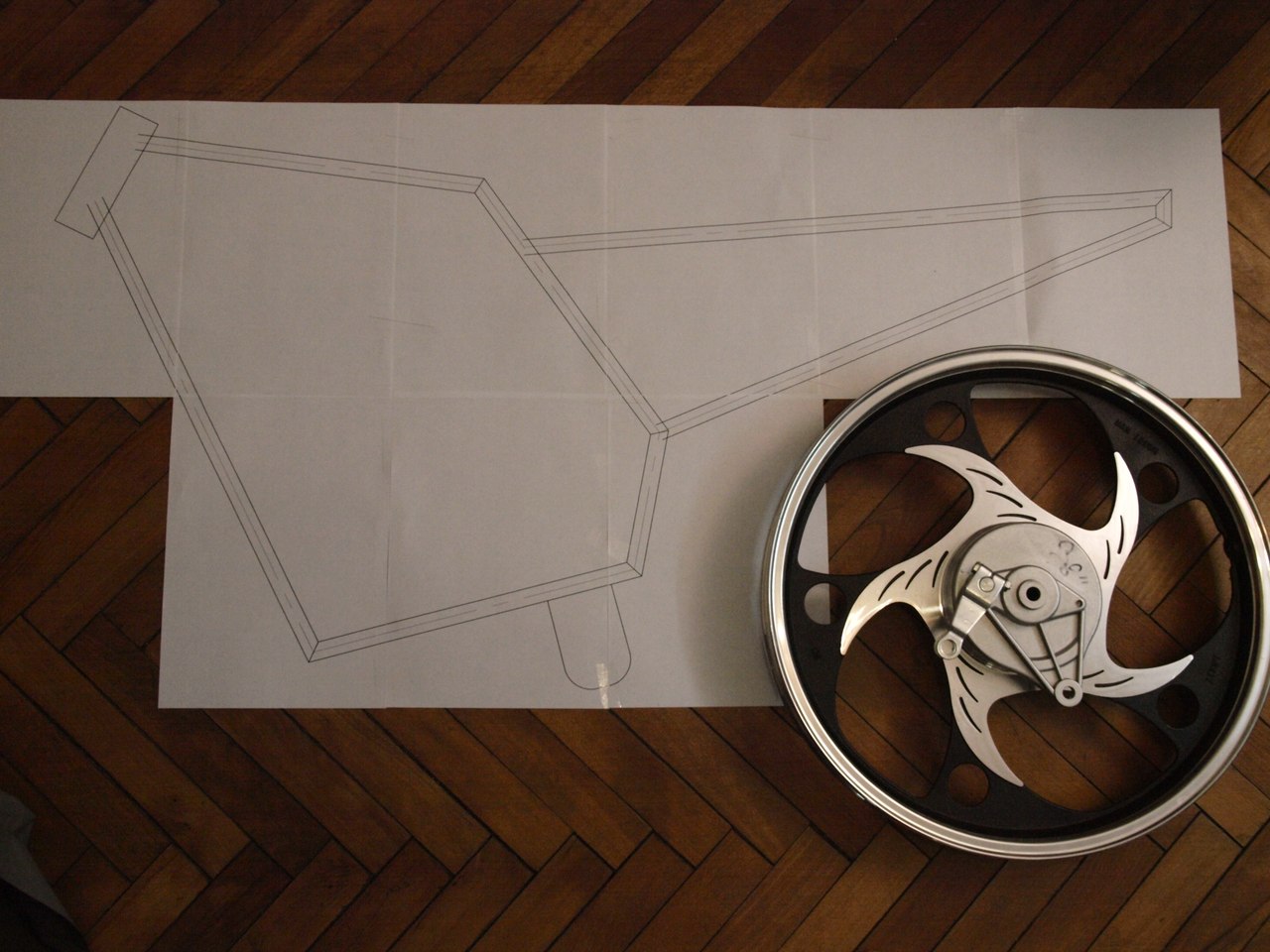 В лютому 2015 року я надумав сконструювати собі центральнопривідний безпедальний транспорт. Почало все як завжди, з примітивного креслення.