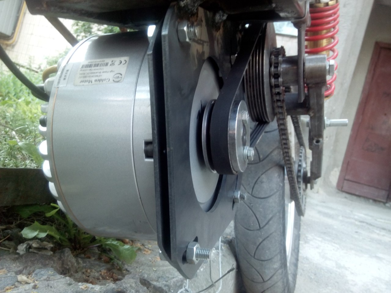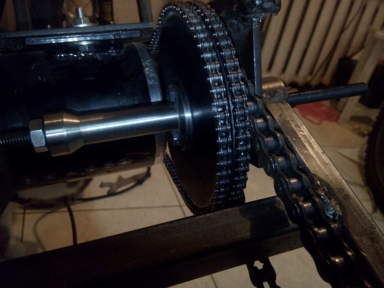 Біда поліклинового ременя, як і всіх гладких - потрібна сильна натяжка для хорошого зчеплення. І коли мокрий - буксував, посвистуючи )) Із існуючих деталей вирішив зварганити ланцюгову передачу першого ступеню.