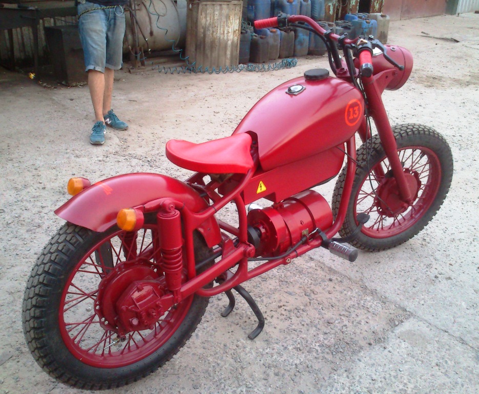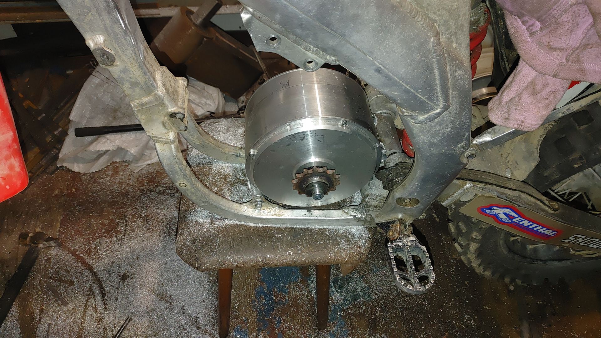 Зробив перший виїзд і трохи був розчарований, хоча і знав що так буде. Саморобний двигун тесли крутився 7500об/хв, якщо перевести це в км/год, то з зірками 14/50 виходить 252км/г. Треба робити редуктор