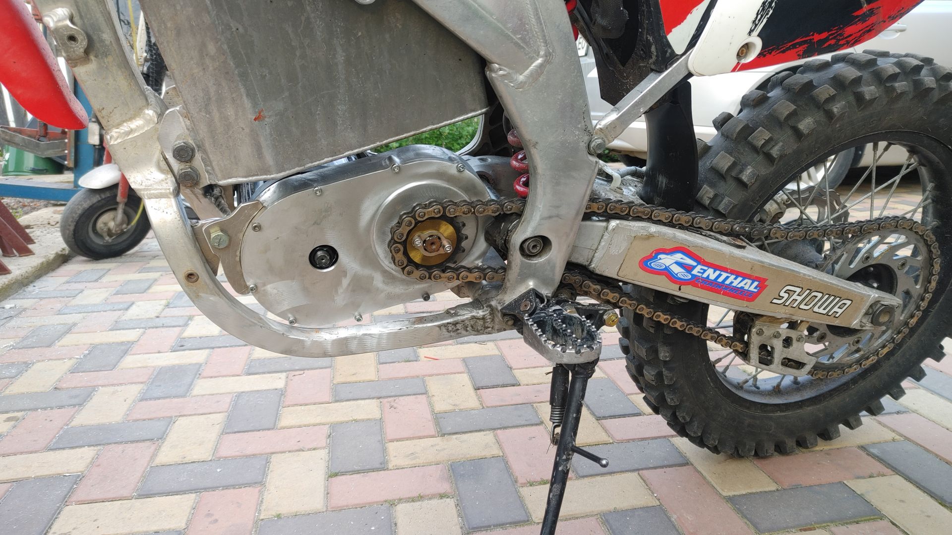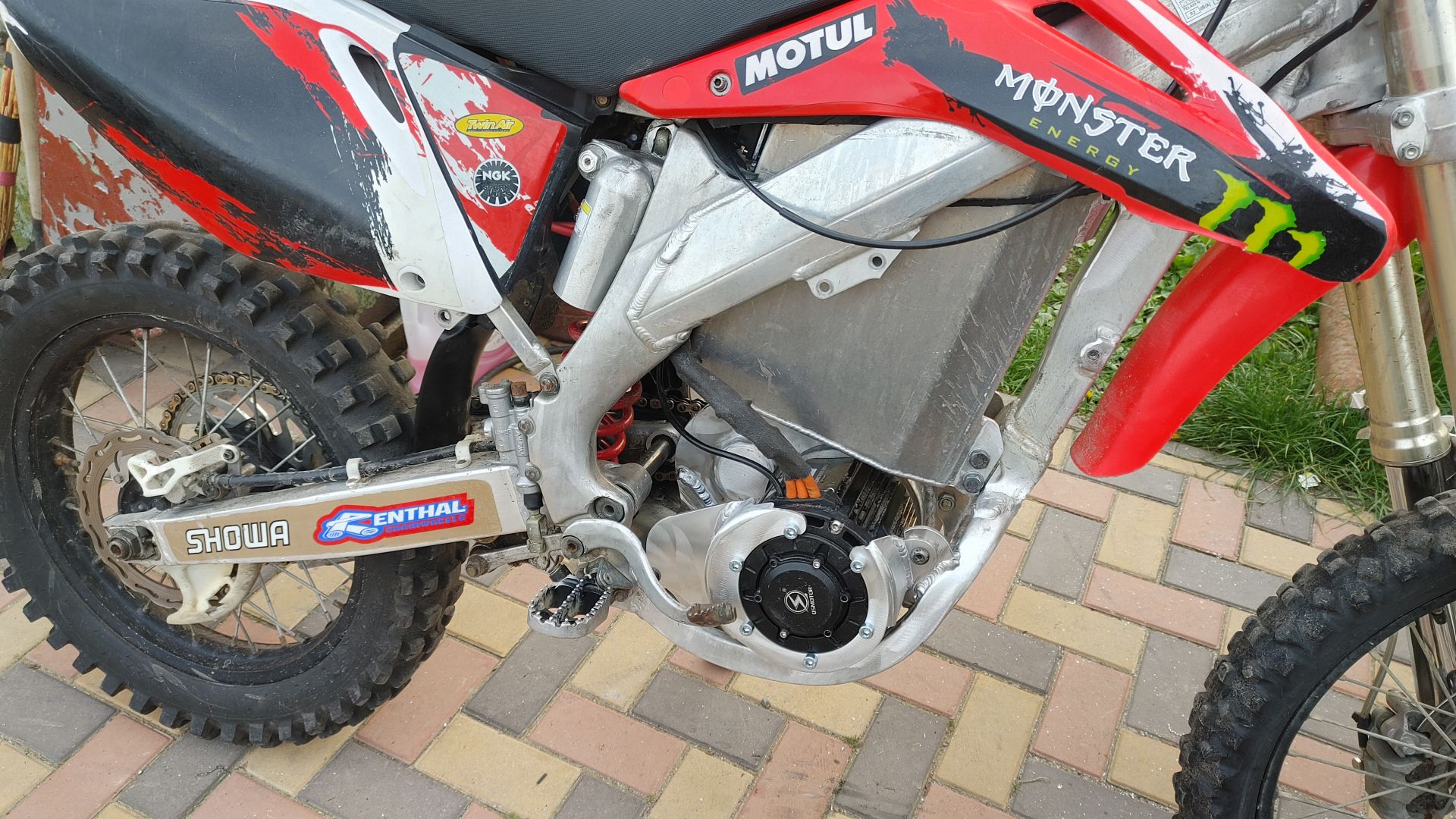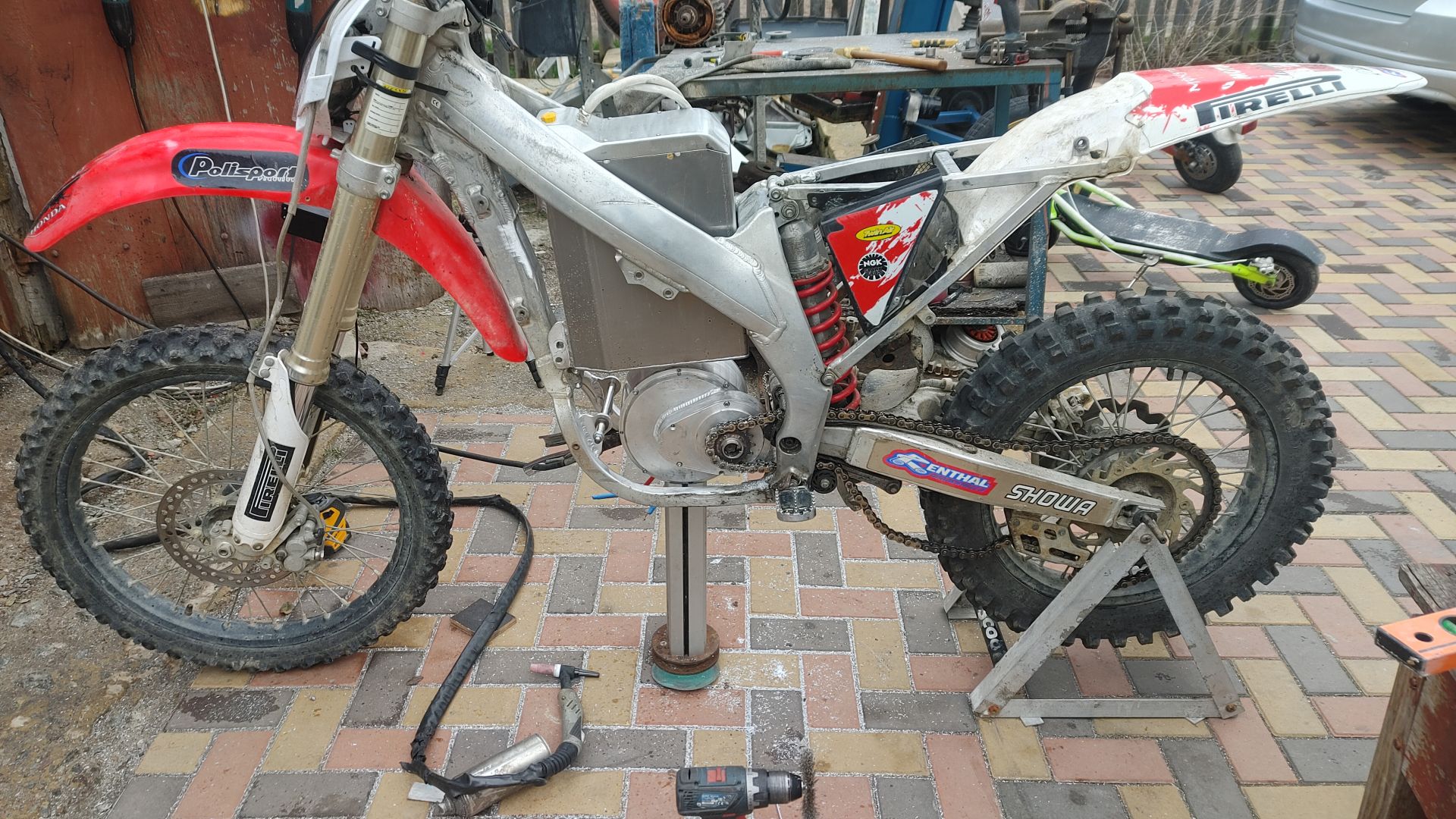 В цей же час, поки робив корпус на двигун та мотав обмотки, переглядвав оголошення з рамами до кросачів і ендуриків. Це продовжувалось досить довго, китайського донора брати не хотів, був не поганий варіант kawasaki klx500 але трохі відштовхувала його вага і те що рама стальна, я хотів алюміній, мені з ним легше працювати. І на початку 2024року знайшов що шукав, це була ходовка з хонди crf450, все окрім двигуна, ідеальний варіант) Недовго думаючи і не довго торгуючись я її купив.