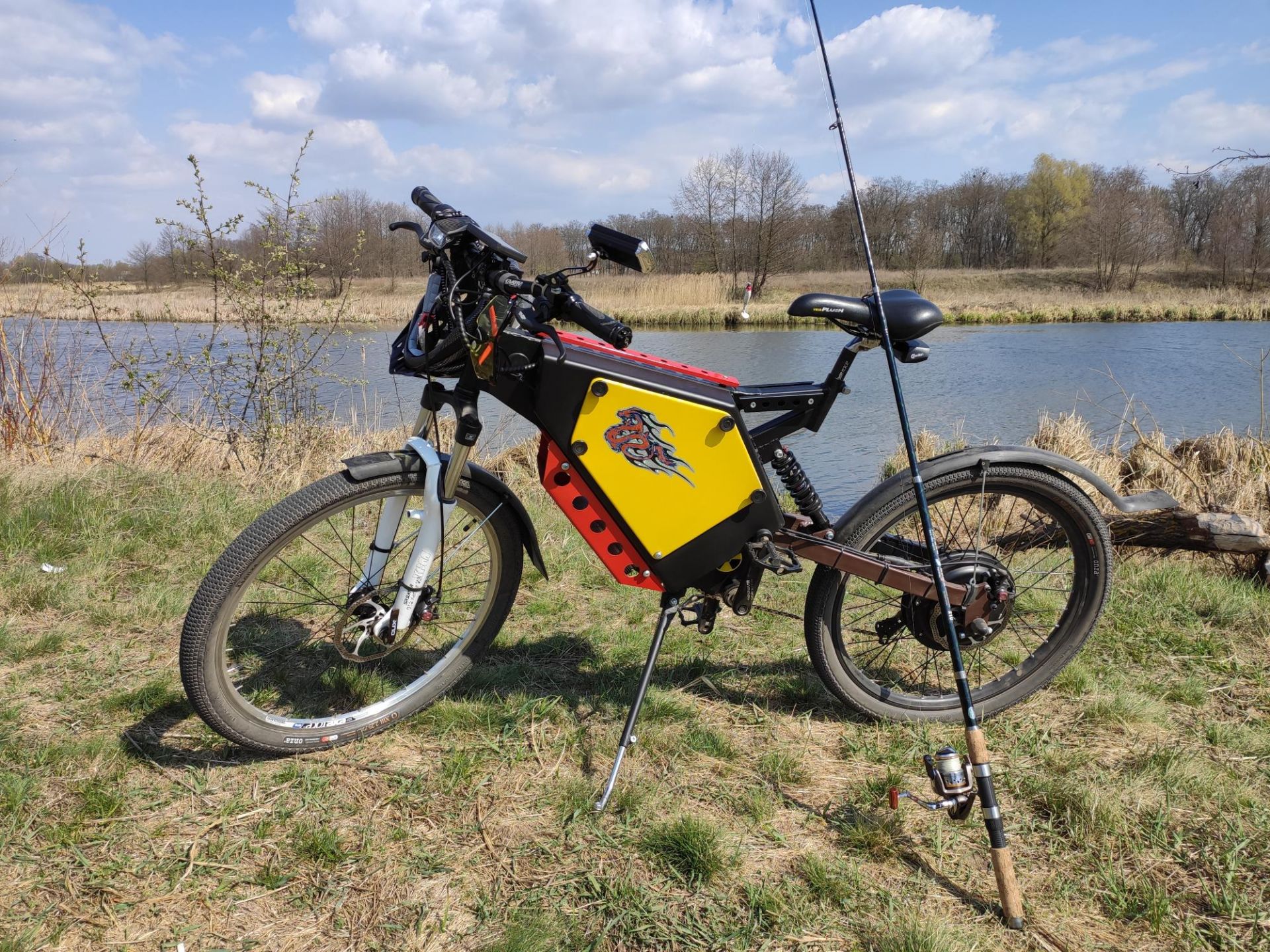 Я собі придбав алюмінієву раму з німеччини двухпідвіс з електровела. Там навіть коробка з контролером була... Бо надоїло їхати на ковбані по своїх дорогах із щебеню. Але рама складається посередині. Хоч бери й завари. Також думаю, як багажник задній зробити.