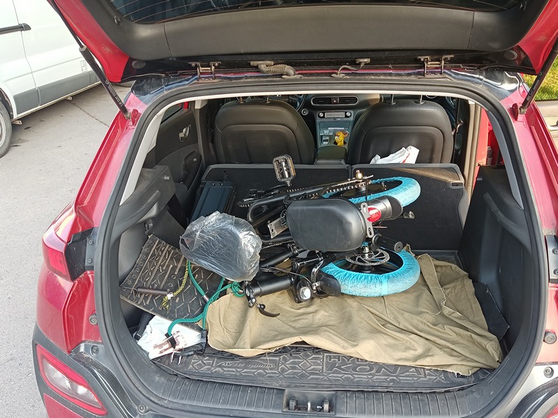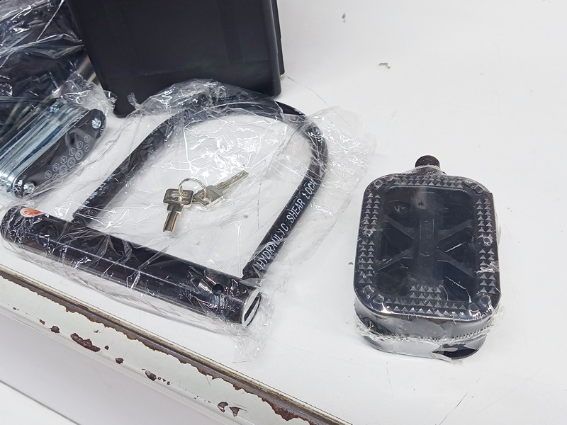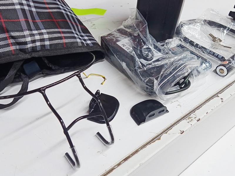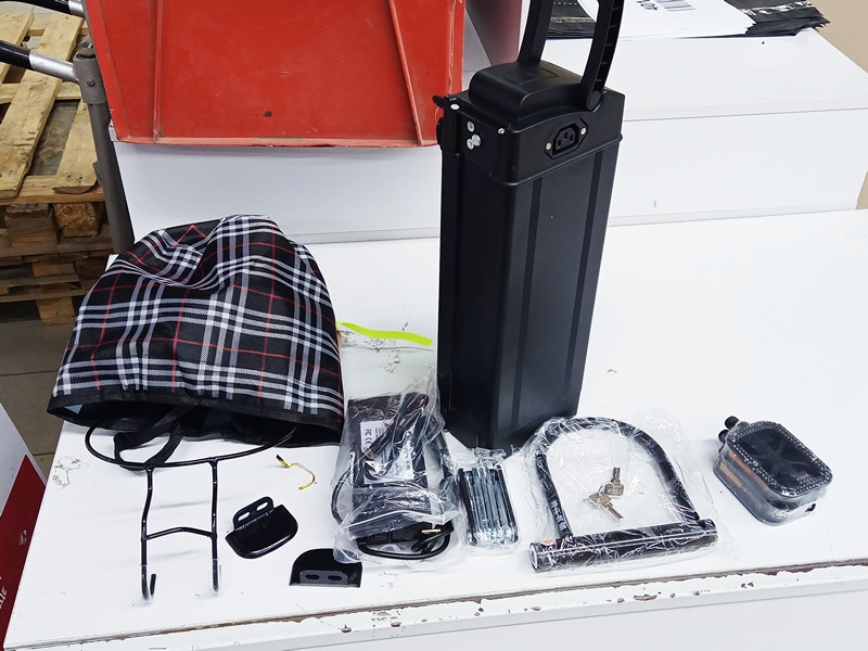 Велосипед в коробке идёт в "разложенном" виде, с прикрученными колёсами, но со снятыми сиденьем, педалями и рулём. Также в коробке лежит "котомка", которая потом цепляется на руль, и в ней — остальная комплектация: зарядник; две педали; замок-блокиратор с ключами; прикручиваемые "подножки" для заднего пассажира; "бонус" — типа как мультитул. Также, в коробке брошены бумаги ("инструкция", накладная, гарантийка), и ещё "бонус" — дождевик :hurra: