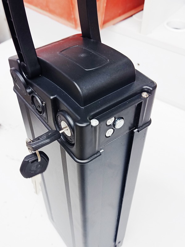 Батарейный блок, вполне приличного вида, с откидной ручкой, с замком. Он "заезжает" по "рельсе" в своё место за сидушкой, и там фиксируется штырём, который входит в отверстие "рельсы" при повороте замка. Hint: чтобы замок "переключился" надо при повороте нажать на ключ.
