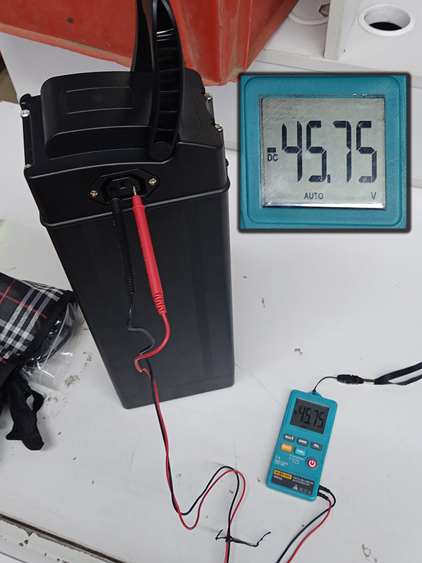 Сразу померял напряжение (как известно, каждый обладатель электротранспорта всегда возит с собой мультиметр! ;) ) — 45.7 вольт, т.е. можно сразу кататься!