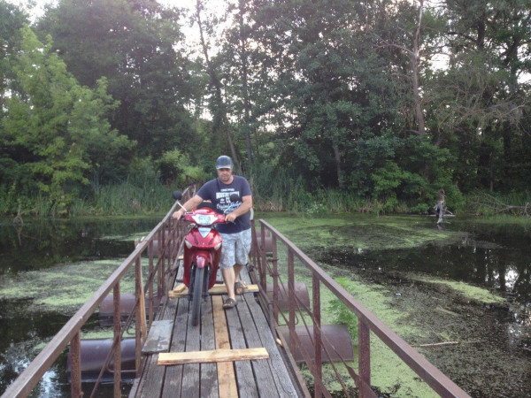 Сьогодні були покатушки. З Танею поїхали до друзів в інше місто. Завантажили багажник подарунками у вигляді смакоти і вперед. Проїхали в цілому 80 км. На залишку в акумуляторі по приїзду 11.5 А.Ч. з 38. Витрата вийшла 23.8 вата на 1 км шляху. З огляду на загальну вагу скутера і нас, цифра витрати добра. Туди дорога жахлива. Думав хоч 40 зможу їхати. Куди там, місцями 20-25. Ями, машини в обох напрямках. Дорожні робітники зі своїми відрами і лопатами. Назад поїхали іншою дорогою. Далі на 6 км але місцями їхали з вітерцем. Правда довелося форсувати річку через понтонний злегка підтоплений міст. Але як би там не було поїздка вдалася. Готуємося до поїздки на відстань в 160 км, з проміжною зарядкою.