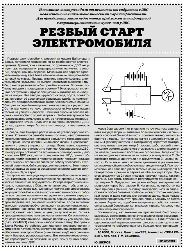 Через бортразъем 1 от внешнего источника тока заряжаются аккумуляторы — литиевый большой емкости 2 и свинцовокислотный 3 малой емкости, соответственно, малых габаритов и массы. При пуске, когда ток в цепи обратимой машины 4 (преимущественно моторколес) нарастает быстро, систему питает аккумулятор 3, хорошо работающий в импульсном режиме. Действие в этом режиме длится недолго, до начала движения с постоянной скоростью. Тогда система переходит на питание от литиевого аккумулятора 2. Он снабжает тяговые двигатели 4 и аккумулятор 3 (малой емкости). Если ток в цепях тягового двигателя 4 увеличивается, переходной режим обеспечивает аккумулятор 2. При торможении или езде под уклон тяговые машины 4 переходят в генераторный режим и заряжают оба аккумулятора. При этом аккумулятор 2 гасит пиковые нагрузки так же, как при разгоне. Скорость движения регулируется обычным контроллером 5. Предусмотрен режим отбора электрической мощности через бортразъем 6. Например, по прибытии на лоно природы (пикник, рыбалку, экскурсию) можно задействовать любые бытовые приборы, а сверх того — колодезный насос и даже маленькую бетономешалку. Надо только вовремя прекратить этот процесс, чтобы доехать до места зарядки. Вероятно, подобные зарядные устройства появятся на каждой бензоколонке, в каждом гараже. А может, и на многих открытых парковках.