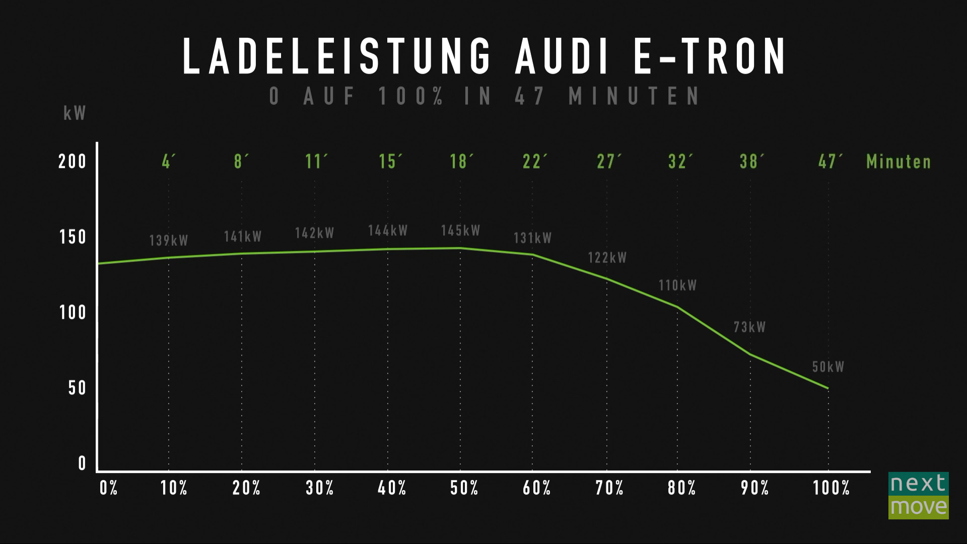 Ауди е-трон с 0 до 100% на 350кВт станции ionity (до 1000В и до 350А) за 47 минут.