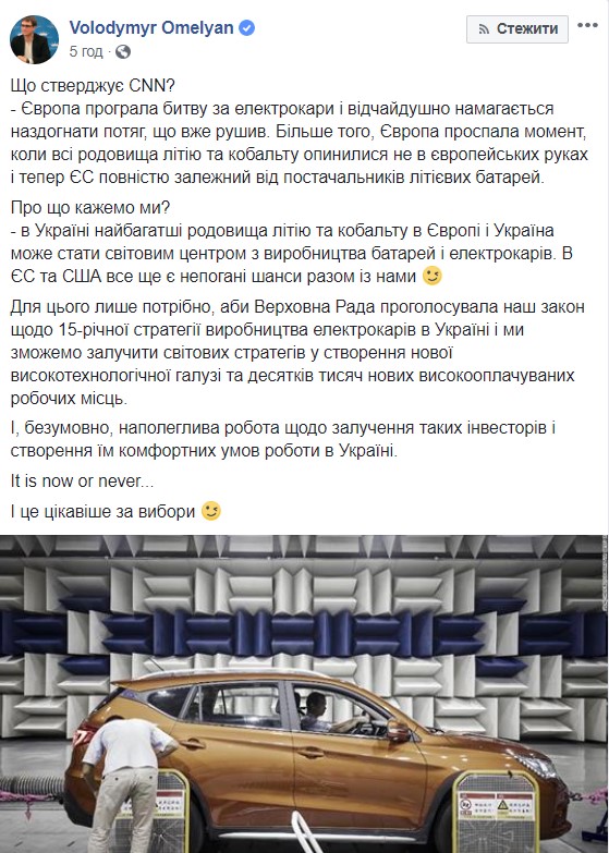 http://ua-independent.com/ukraina-mozhe ... ov-omelyan "Украина может стать мировым центром по производству батарей и электрокаров", - Омелян Украина может стать мировым центром по производству батарей и электрокаров, ведь у нас самые богатые месторождения лития и кобальта в Европе Об этом министр инфраструктуры Владимир Омелян написал на своей странице в Facebook. "В Украине самые богатые месторождения лития и кобальта в Европе, и Украина может стать мировым центром по производству батарей и электрокаров", - написал Омелян. Он прибавил, что для этого необходимо принятие Верховной Радой закона о 15-летней стратегии производства электрокаров в Украине. "Для этого только нужно, чтобы Верховная Рада проголосовала наш закон относительно 15-летней стратегии производства электрокаров в Украине, и мы сможем привлечь мировых стратегов в создание новой высокотехнологичной отрасли и десятков тысяч новых высокооплачиваемых рабочих мест", - отметил Омелян. Министр прибавил, что также необходима настойчивая работа по привлечению таких инвесторов и созданию им комфортных условий работы в Украине.