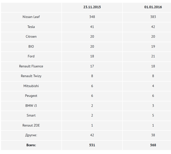 Всего за 6 месяцев 2015 года у нас был зарегистрирован 231 электромобиль. Nissal Leaf лидирует - 149 штук, далее Tesla Model S (21 шт) и Renault в количестве 19 экземпляров (вероятно, Fluence ZE, в статистике МВД модель не уточняется).