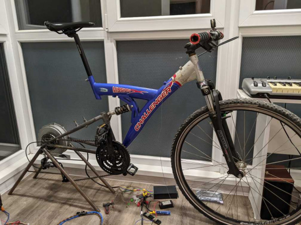 Придбав простий задній мотор прямого приводу, зібрав з різних підвальних велокомпонентів все необхідне та зварив з трубок тримач заднього колеса, та окремо ще прикрутив тримач заднього перемикача на саморізи. В цілому конструкція стоїть але трохи все ж хитається, особливо при більш активному педалюванні.