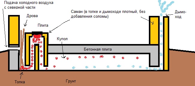 Сама топка может быть как за пределами здания так и внутри (открываем дырку в полу и закидываем дровишки(видели наверно такое в японских и китайских фильмах), щелью в этой дыре регулируем приток воздуха в печь, типа поддувало). Весь пол дома стоит на небольших по высоте кирпичных(каменных) колоннах, т.е.