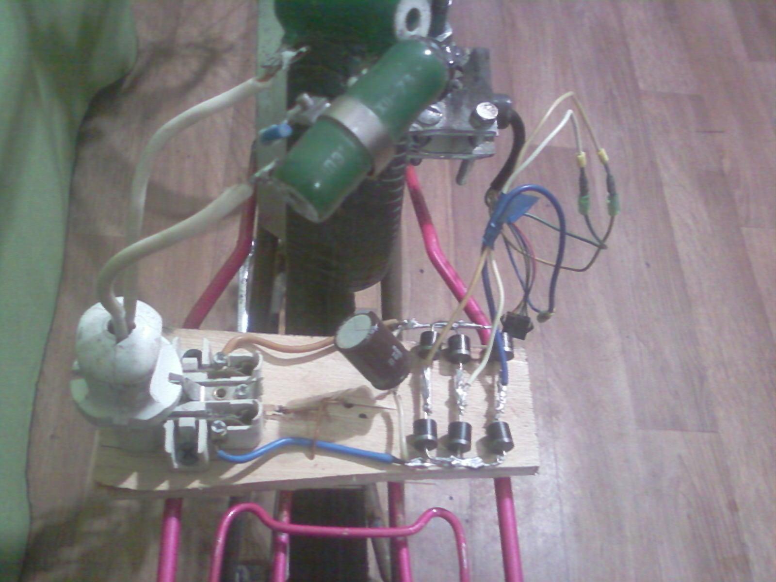Решил сделать генератор на черный день, самый простой, соотвественно быстро собираемый, за день( субботу) я его и сделал. Схема самая простая и банальная поставить мотор-колесо гироскутера на заднее колесо веломашины. Почему я выбрал эту схему, во-первых: Не нужно перематывать или менять схему включения обмоток мотора. Во вторых, нет необходимости сверлить крышку мотора и ставить звезду для цепи. Втретих можно использовать любой взрослый велосипед, не нужно варить громоздкую конструкцию, которая будет только мешать и пылиться в доме. И в четвертых, мотор от гироскутера можно использовать по прямому назначению в качестве электродвигателя велосипеда, подключев к нему контроллер. У меня была рама от спортивного велосипеда, я её когдато давно почистил под покраску, но руки не дошли, валялась в гараже, Поставил колеса цепь звезду, шатуны, прикрепил мотор от гироскутера через коромысло с центром в креплении подседельного штыря, с одной стороны мотор с другой пружина(еще не нашел). Сделал простой крепеж и двух пластин, зажал прихватил сваркой, для надежности(можно и без) Сварил упор под заднее колесо, можно его и на болтах сделать, укого нет сварки. Спаял выпрямитель на диодах 10Ампер, в магазинах от 3-до 5 грв, конденсатор взял наугад от старого тв 1000мкФ-50В, припаял старую розетку для подключения нагрузки и все, электростанция готова! Для размещения выпрямителя взял багажник от детского велика, увеличил крепежа упоры, теперь на багажник можно ставить аккумыляторы, все стало компактным. Теперь испытания, передаточное число примерно 7.5 Напряжение под нагрузкой 35в, ток 5а = 175Вт , что соотвествует номинальным параметрам мотора гироскутера! Значит велосипед с этим мотором, будет ездить при номинальных нагрузках, можно ставить контроллер.