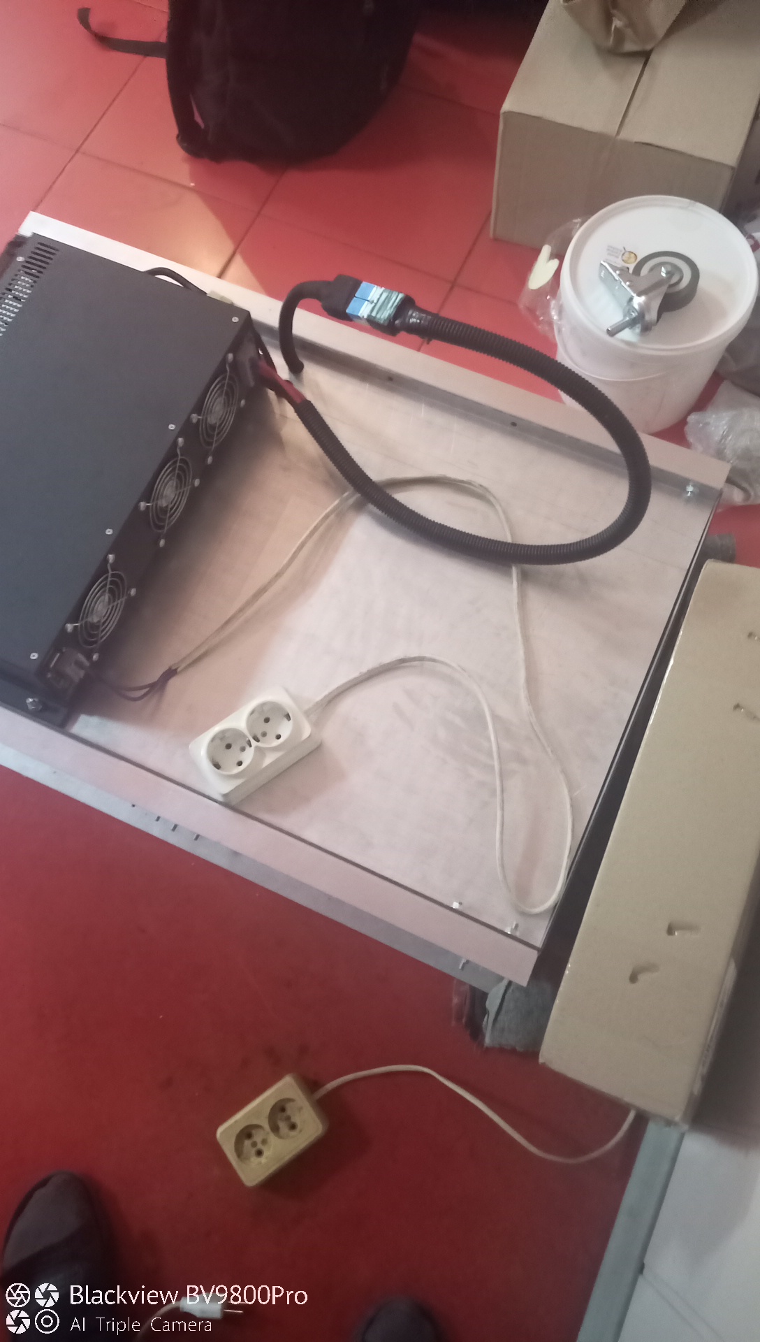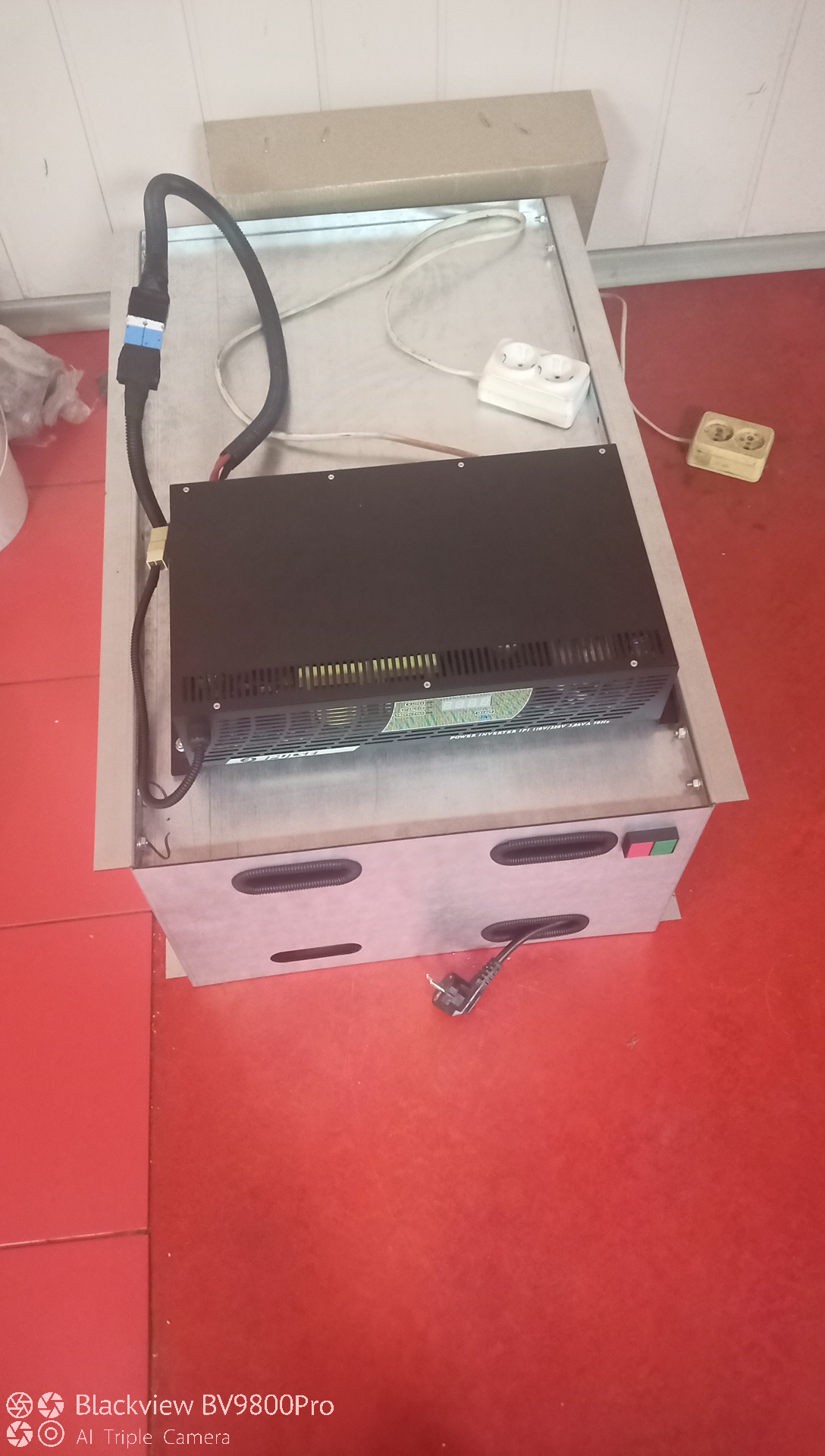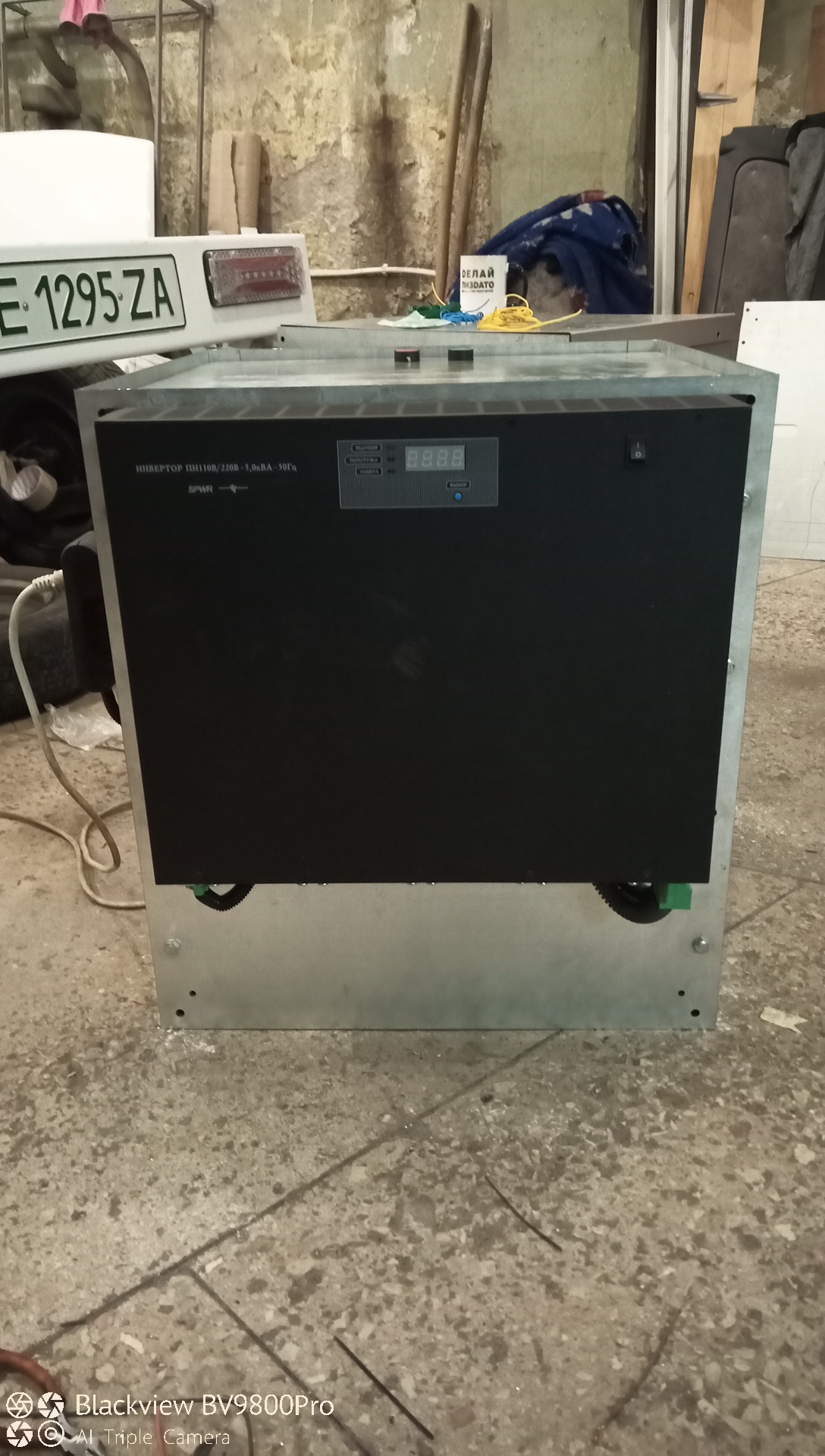 Зібрав систему безперебійного живлення 220 В, на основі батарейних модулів Chevrolet Bolt. Батарея зібрана з троьх модулів 3p10s, з'єднаних послідовно. Загальна напруга у діапазоні 99...124,5 В (3,30...4,15 на комірках), ємність 17 кВтг. Система побудована як онлайновий безперебійник, тобто при зникненні напруги у мережі система продовжує працювати на навантаження, без розриву потужності. Вихід змінної напруги забезпечує інвертор 110/220 3kVA, чистий синус. Зарядний пристрій від мережі видає 20А зарядного струму. Керування системою побудовано на БМС від Романтика і декількох реле. Для живлення БМС використовується невеликий БП для світлодіодів 110В/12В. Корпус зібраний на болтах М6, зі сталевих оцинкованих панелей 2мм, порізаних лазером і зігнутих на ЧПУ. Загальна вага вийшла біля 100 кг, тому для переміщення по підлозі була виготовлена підставка на колесах.
