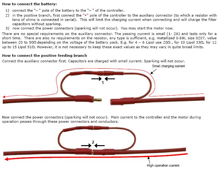 В мене на електробайку стоїть автомат (живлення 48в), паралельно йому двохватний резистор (десь 10 Омм по пам'яті). Підключаю кабель з вимкнутим автоматом(як що не забуваю :D ) Як що газанути забувши ввімкнути автомат, то мотор смикнеться, і контроллер вимикається бо напруга на вході впаде нижче 40в із за резистора, резистор здохнуть не вспіває. При включенні автомата само собою нічого не шваркає бо резистор уже все зарядив.