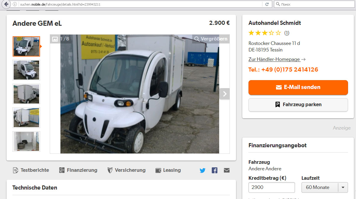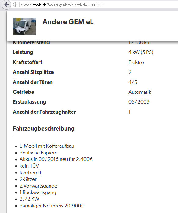 Нашёл такой грузовик б/у 2009года за 2900€. Не очень понятно написано, но вроде новые аккумуляторы стоят к нему 2400€. http://suchen.mobile.de/fahrzeuge/detai ... =239943211