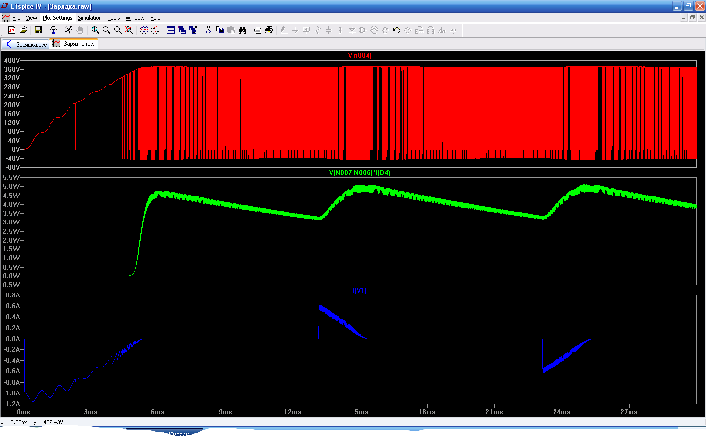 Видно что в момент "периодической подзарядки" входного конденсатора в режиме работы - из сети в пиках потребляется ток 0,6 ампера.