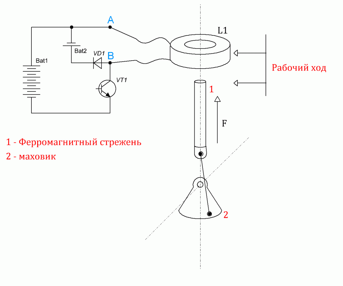 Ниже приведены три рисунка, импульсного поршневого электромагнитного двигателя, так как более естественным и простым для понимания является прямолинейное движение при отталкивании э.магнитов: Первый рисунок - это ИПЭД работающий на притягивание. Он состоит из рабочей катушки индуктивности L1, которая жестко фиксирована по отношению к поршню-ферромагнитному стержню. Ферромагнитный стрежень в свою очередь представляет из себя аналог поршня в ДВЗ, и может смещаться по направлению силы F. Поршень связан с кривошипным маховиком, который уже преобразует поступательное движение в вращательное. На рисунке отображен условный рабочий ход. Момент времени когда ключ VT1 замыкает катушку L1 на источник BAT1 соответствует положению нижней точки рабочего хода поршня 1. Момент выключения ключа VT1 соответствует верхней точке рабочего хода поршня. При этом катушка индуктивности в данном случае для схемы управления представляет из себя обычный дроссель, который в прямом ходе "накапливает" энергию, а в обратном - возвращает в виде индуктивного броска, с одной лишь тонкостью - что смещение ферромагнитного поршня вызывает модуляцию параметра индуктивности катушки в каких то пределах. Преимущество такого ИПЭД в том что он относительно прост в реализации по отношению к остальным моделям ИПЭД. Недостаток такой системы заключается в том что магнитный поток взаимодействующий с поршнем создается тогда - когда поршень относительно далеко от источника этого потока, а как мы знаем, интенсивность магнитного потока убывает на квадрат расстояния, то и есть словами простых смертных - к катушке прилаживается напряжение тогда - когда то - с чем она должна взаимодействовать - далеко - по этому взаимодействие слабо и не эффективно ( относительно ) . На втором рисунке представлен схемотехнически ИПЭД работающий на отталкивание... Фактически, как то видно из рисунка - ничего не изменилось, за исключением того - что на место поршня установлена вторая катушка, таким образом блок такого двигателя содержит уже две катушки L1 и L2. Отличие такого ИПЭД от предыдущего кроется не только в его конструкции но и в временной диаграмме, а именно рабочий цикл ( момент подачи тока ) начинается тогда когда подвижная катушка L2 находится в верхней точке рабочего хода, что соответствует минимальному расстоянию между взаимодействующими катушками - как результат высокая эффективность формирования механического усилия, собственно это и является преимуществом такой системы. Из основных недостатков можно обозначить сложность конструкции ( например все силовые узлы должны быть выполнены с учетом взаимодействия этих узлов и электромагнитного узла). Есть еще одна тонкость связанная с работой ИПЭД, заключается она в том что электромагнитную систему можно запускать в резонансном режиме - а именно форсировать скорость электромагнитного взаимодействия. Пример такой реализации представлен на третьем рисунке. В чем фишка такого метода ? вопрос "коварен" .. по сейму мое ИМХО - фишка в том что в резонансном режиме скорость изменения тока di/dt, на определенных временных участках в индуктивной цепи может превышать скорость изменения тока в этой же цепи в не резонансном режиме. А как Мы знаем - именно скорость изменения тока в индуктивной цепи определяет "силу" магнитного взаимодействия между это