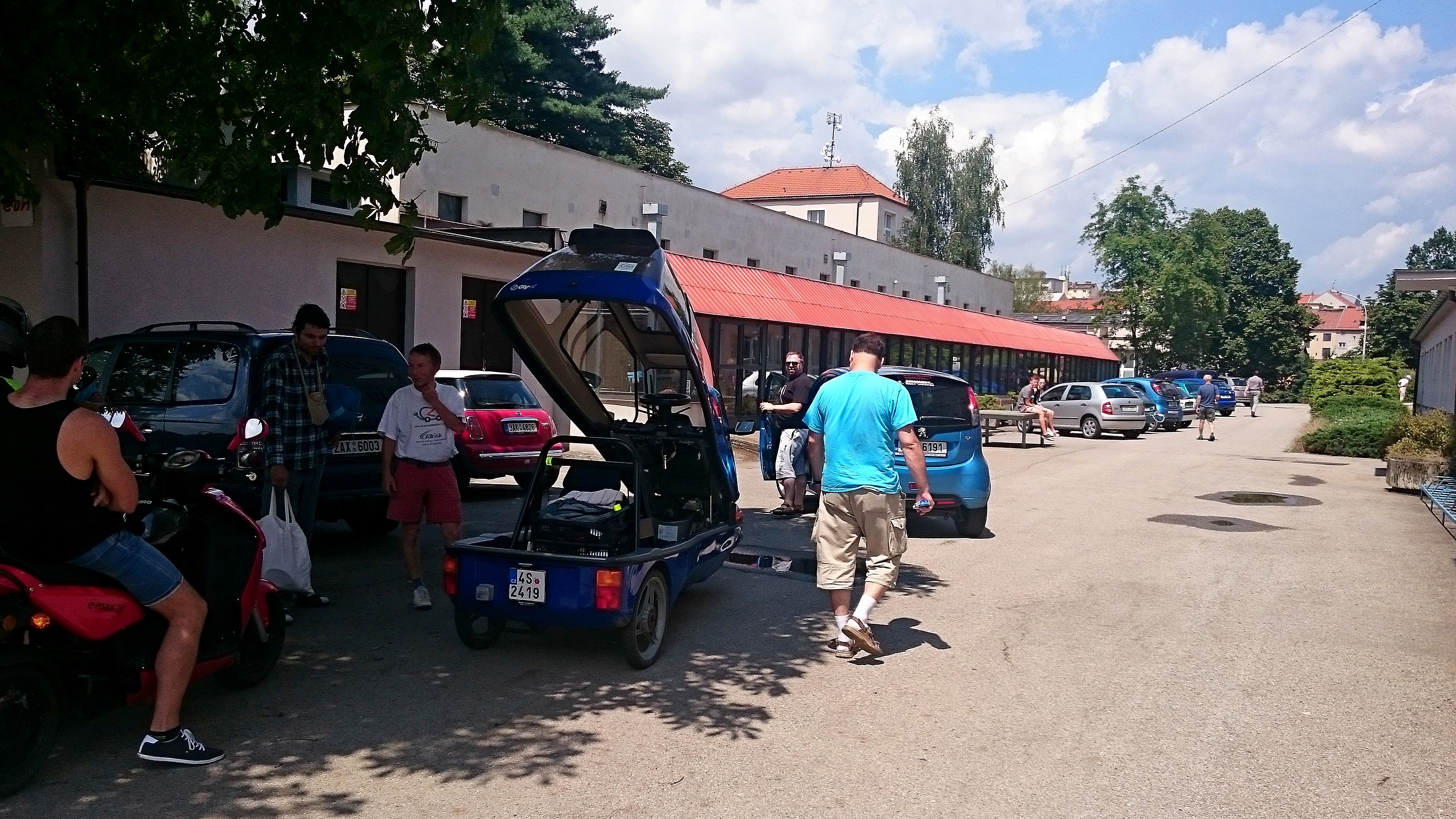 На прошлых выходных прошел очередной, одиннадцатый, слёт чешских электромобилистов. Вот небольшой фотоотчёт созрел. Я смог приехать на второй день , ближе к официальной части , которая на этот раз была 8го июля в городе Табор в Промышленном техникуме (так бы это называлось у нас) там директор поддерживает наше движение и на его здании есть даже общедоступная зарядка, но а в день слёта был доступ ещё к нескольким промышленным розеткам во дворе , а так же к аудитории в которой собственно и прошла официальная часть. Из основного лагеря в Седлец-Прцицах и из других мест , народ (большинство на электромобилях, хотя были и на обычных ) стал приезжать в Табор часов с одиннадцати , становиться кому надо на зарядку и общаться.